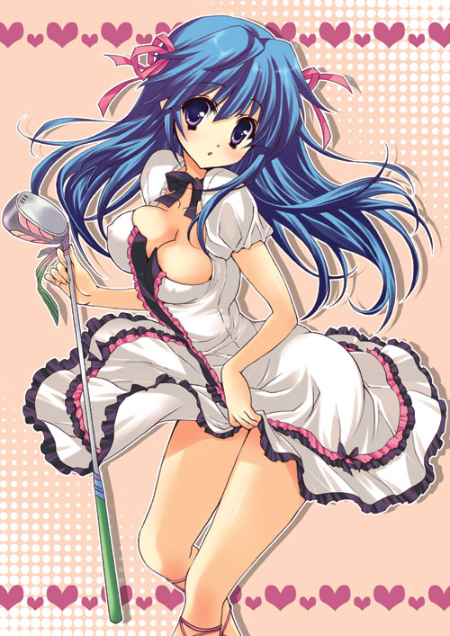 1girlblue eyesblue hairbreastscleavagedressfemale focusgolf clubhair ribbonlong hairmatching hair/eyesmedium breastsribbonsolowindwind lift
