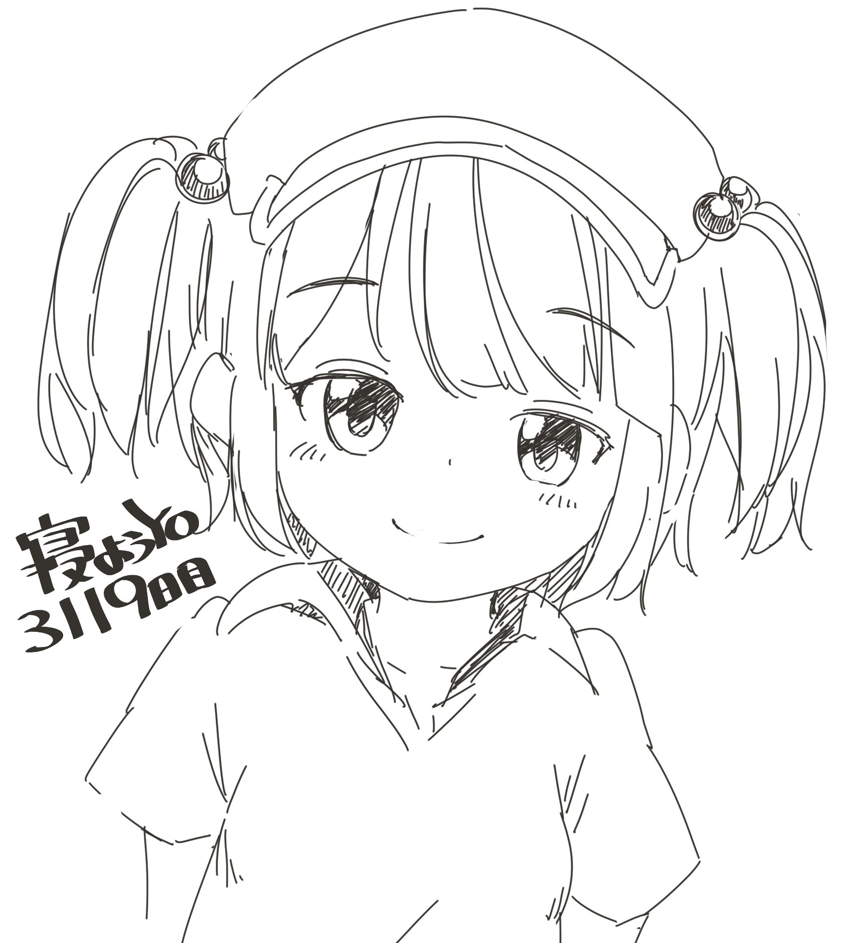 1girlblushclosed mouthcollarboneflat caphair bobbleshair ornamenthatlooking at viewermonochromeshort sleevessmilesoloupper body