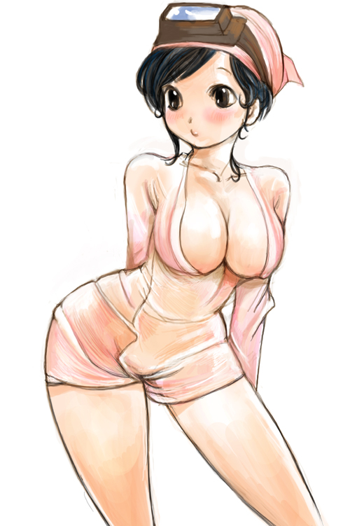 arched backblack hairblushbreastsbrown eyescleavagegoggleslarge breastslegs apartshort hairsimple backgroundsolostandingswept bangswhite background