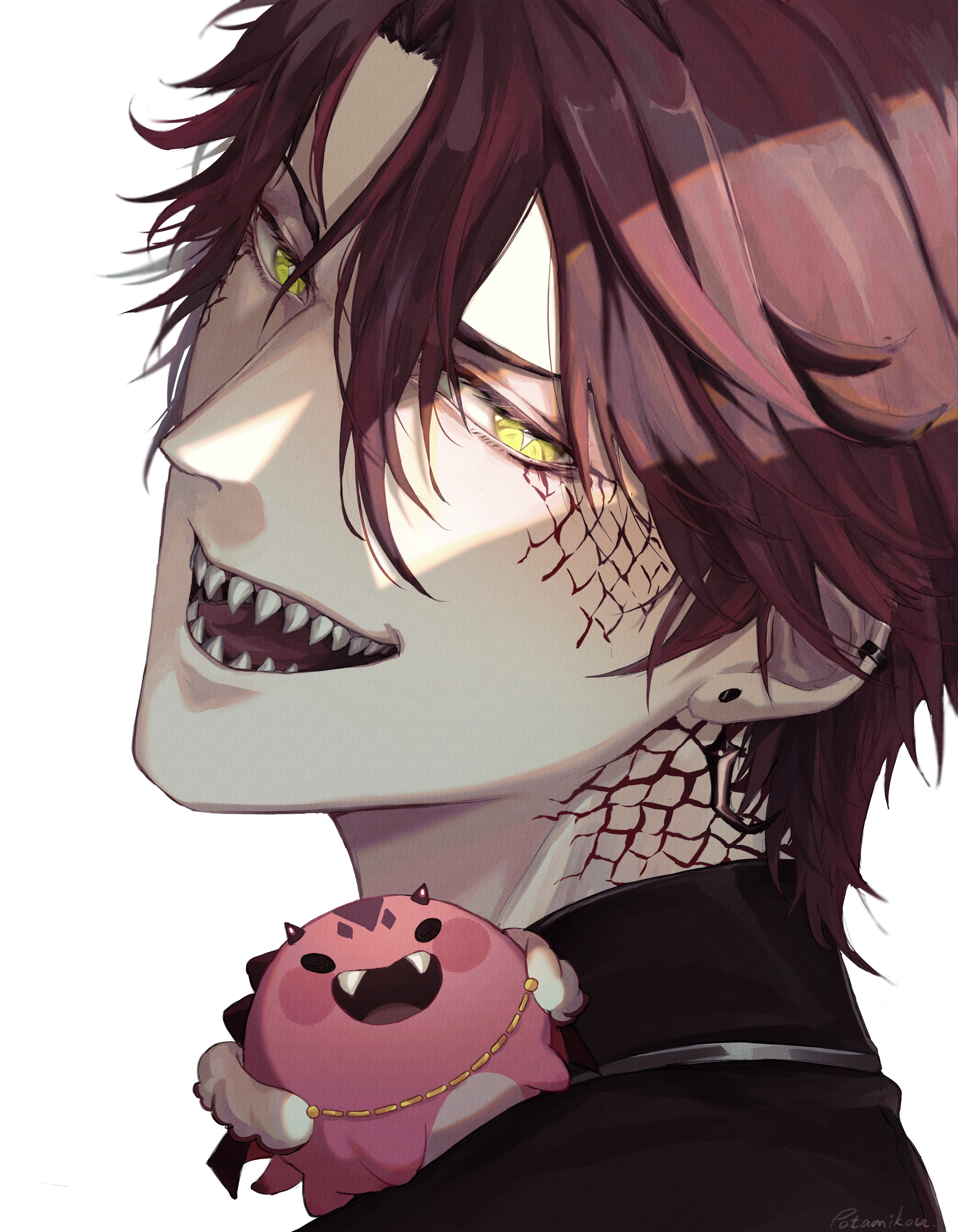 1boyartist namecapecreatureearringsfangsfur trimfur-trimmed capehair between eyeshornsjewelrylooking at viewermale focusopen mouthportraitred hairscalessharp teethslit pupilssorawrity (jurard t rexford)stud earringsteethvirtual youtuberwhite backgroundyellow eyes