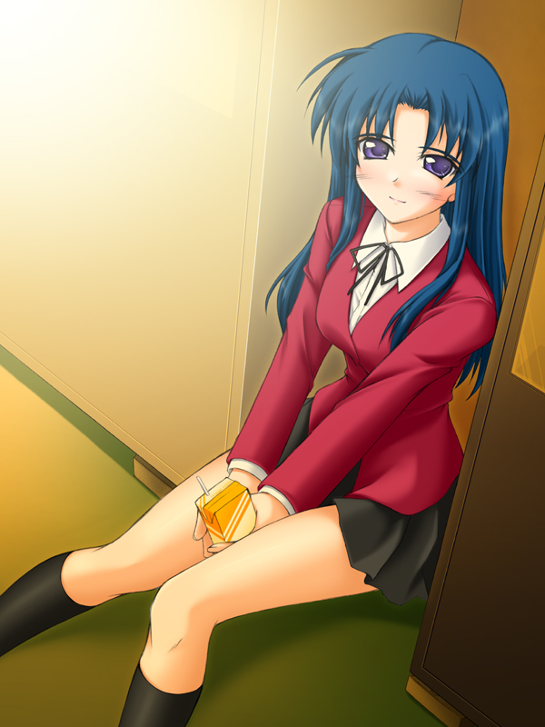 00sblack socksblazerblue eyesblue hairblushbowbowtiedress shirtjacketjuice boxkneehighslong hairminiskirtpleated skirtschool uniformshirtsittingskirtsmilesockssolo