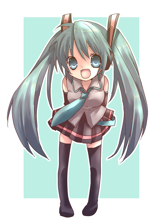 aqua eyesaqua hairarms behind backdetached sleeveslong hairnecktieskirtsolothighhighstwintailsvery long hair