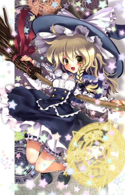 1girlblonde hairbloomersblushbowbraidbroomcapeletembellished costumefemale focusfrillshair bowhatlacemagic circleopen mouthside braidsmilesolostar (symbol)underwearwitch hatyellow eyes