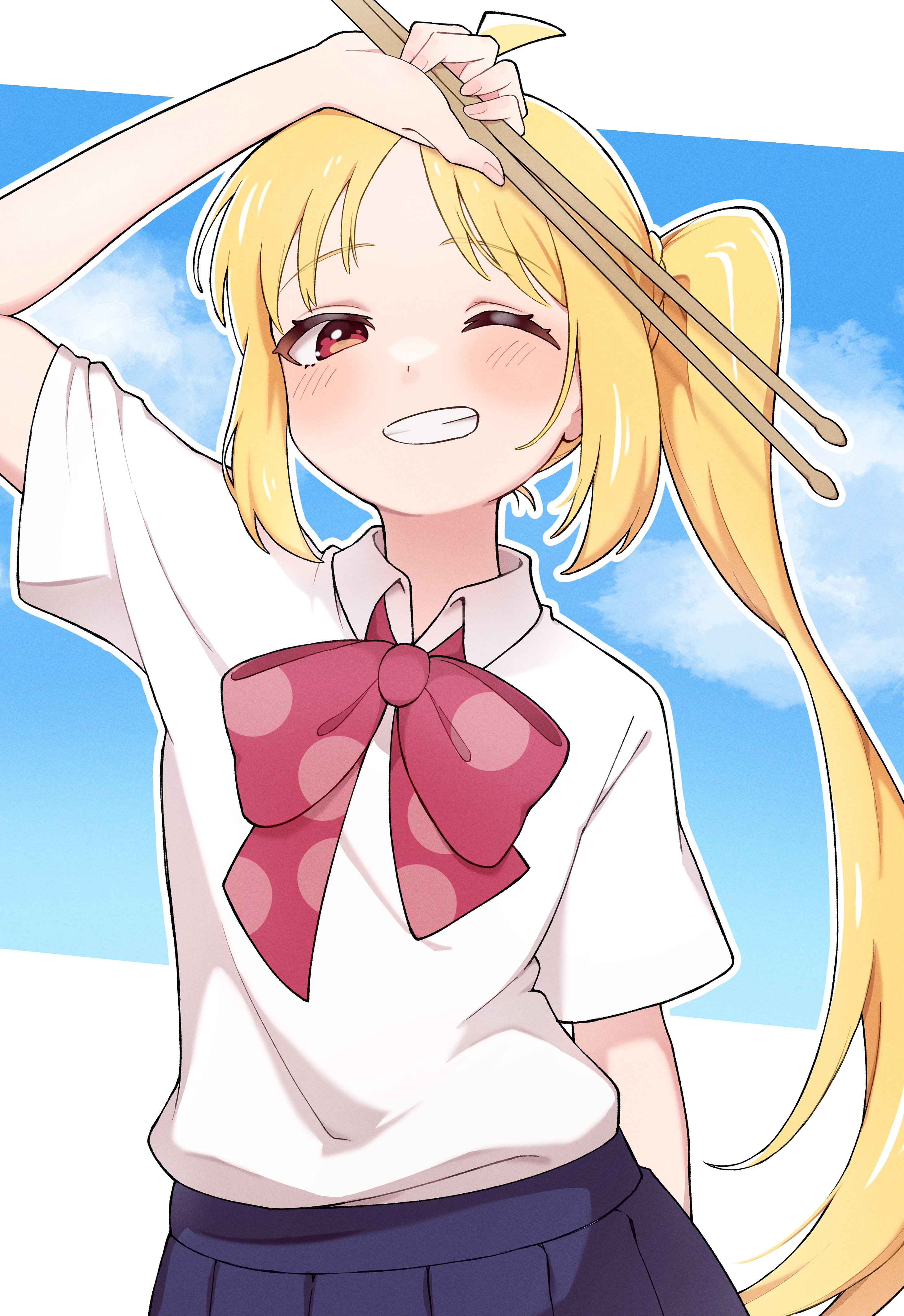 1girlahogearm upblonde hairblushbowbowtiecollared shirtdrumsticksgrinholdingholding drumstickslong hairlooking at viewerone eye closedpleated skirtpolka dotpolka dot bowred eyesschool uniformshirtshirt tucked inshort sleevesside ponytailskirtskysmilesolovery long hair