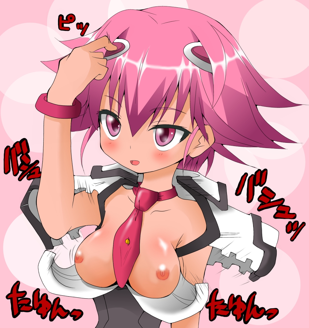 00s1girlblushbraceletbreastsbuttonsfemale focushair ornamentjewelrymedium breastsnecktiepink eyespink hairpurple eyespush-buttonsolo