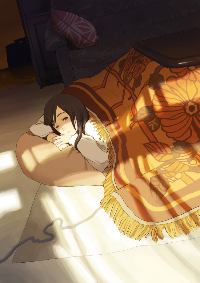 1girlbrown haircablecouchfemale focushalf-closed eyesindoorskotatsuown hands togetherpillowsoloswept bangstableunder coversunder tablewooden floor