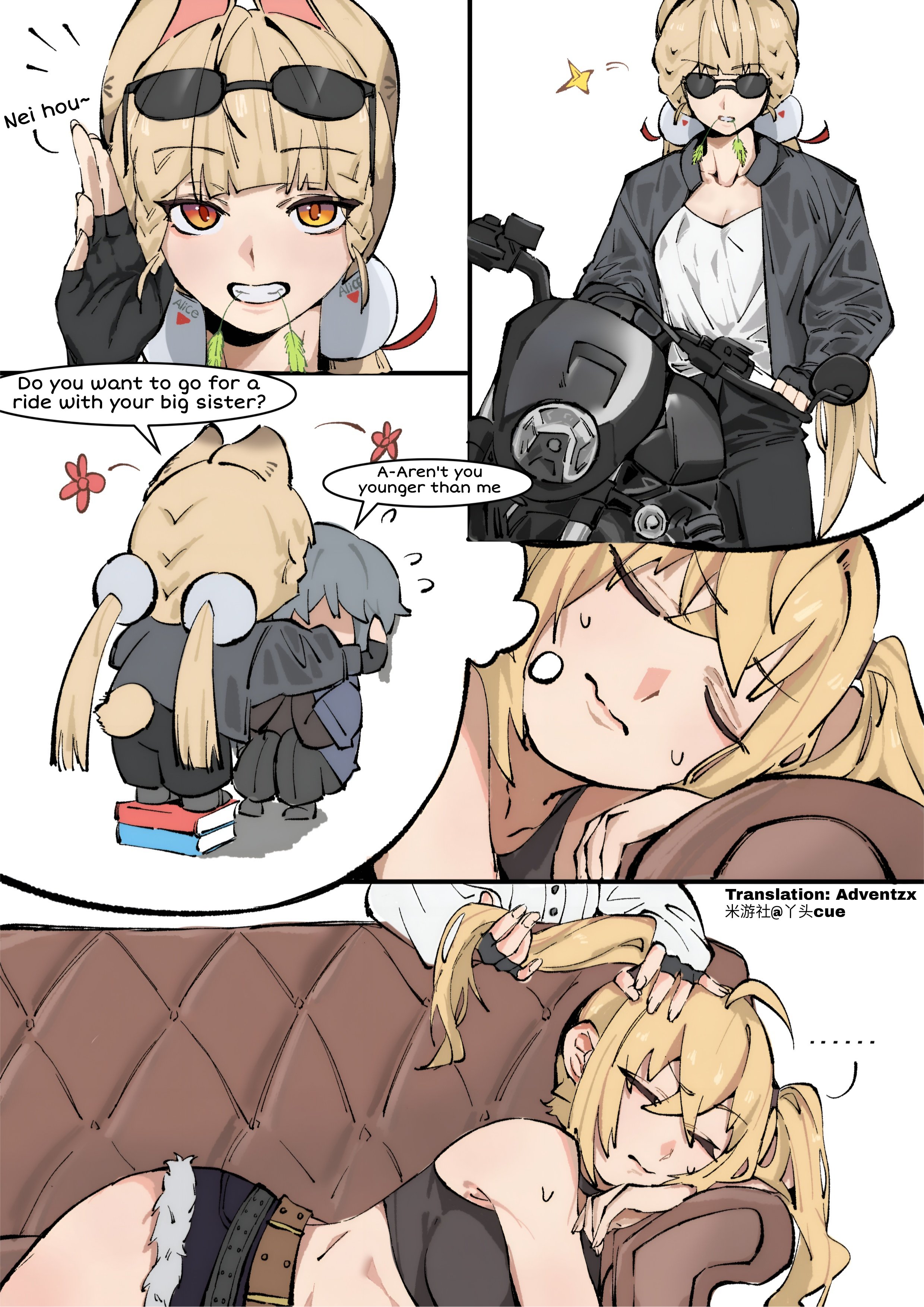 1boy2girlsagainst wallalternate costumeanimal earsbeltbookchibiclosed eyescouchdreamingfemdomfingerless glovesflirtingglovesheterochromiajacketleatherleather jacketlight blushlong hairmotor vehiclemotorcyclemultiple girlson couchshortssmilespeech bubblesunglassessweatteethtwintails