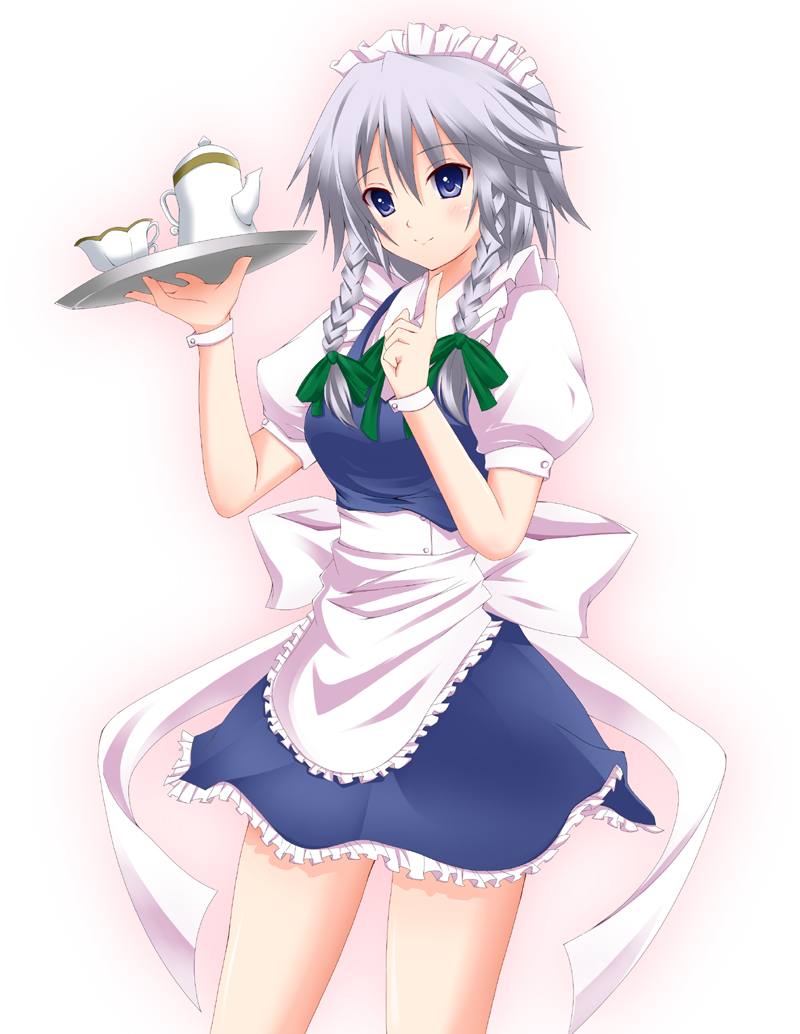 1girlblue eyesbowbowtiebraidcowboy shotcupfemale focusgradient backgroundgreen bowgreen bowtiemaidsolostandingteacupteapotthighstraytwin braidswhite backgroundwrist cuffs