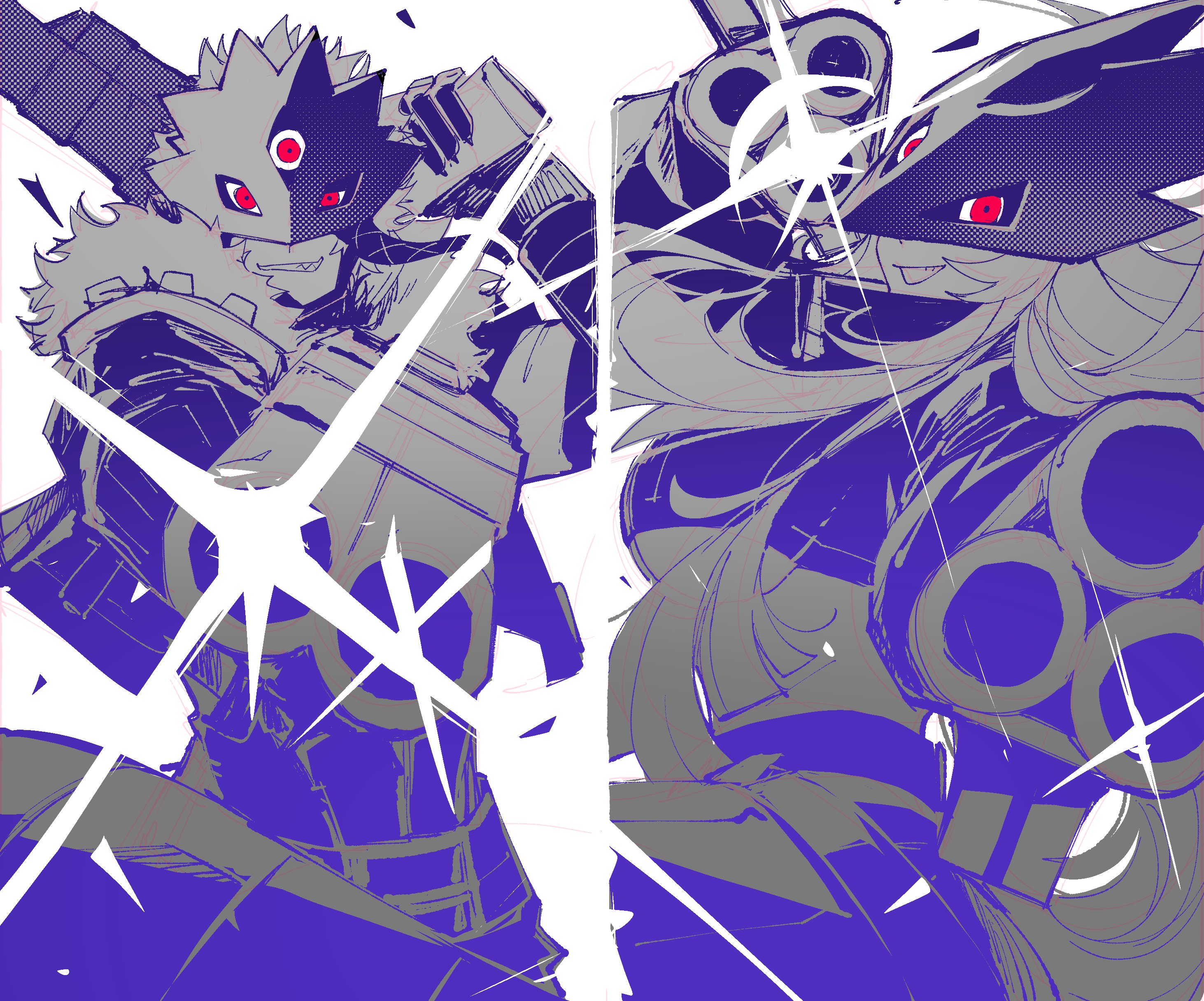 1boy1girlbreastscowboy shotdigimon (creature)dual wieldingglintgunholdingholding gunholding weaponlarge breastslong hairmonochromesharp teethshort hairsimple backgroundsmirkspot colorteeththird eyeweaponwhite background