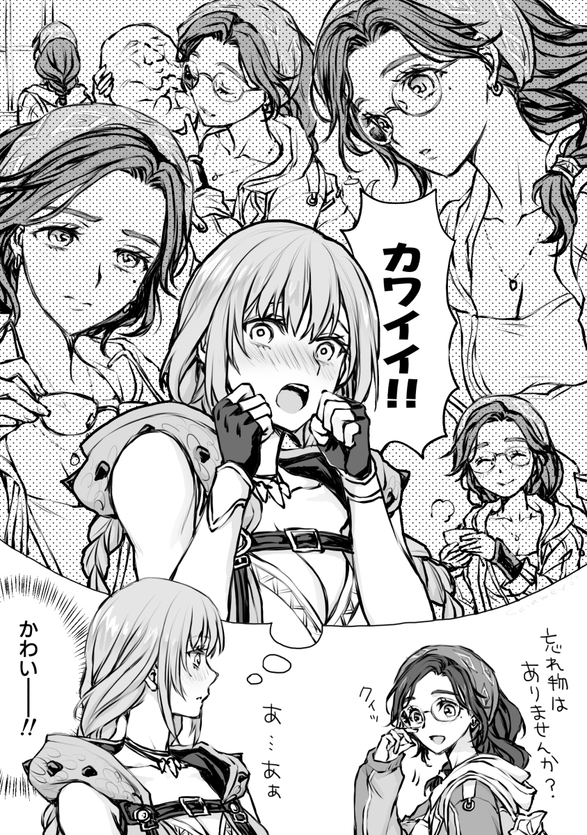 2girlsaqua bandanabandanablack-framed eyewearblushbreastsbrown eyesbrown hairbrown-framed eyewearcleavageglassesgreen bandanagreyscalejacketjewelrylarge breastslong hairlooking at viewermonochromemultiple girlsnecklaceopen mouthsmileyuri