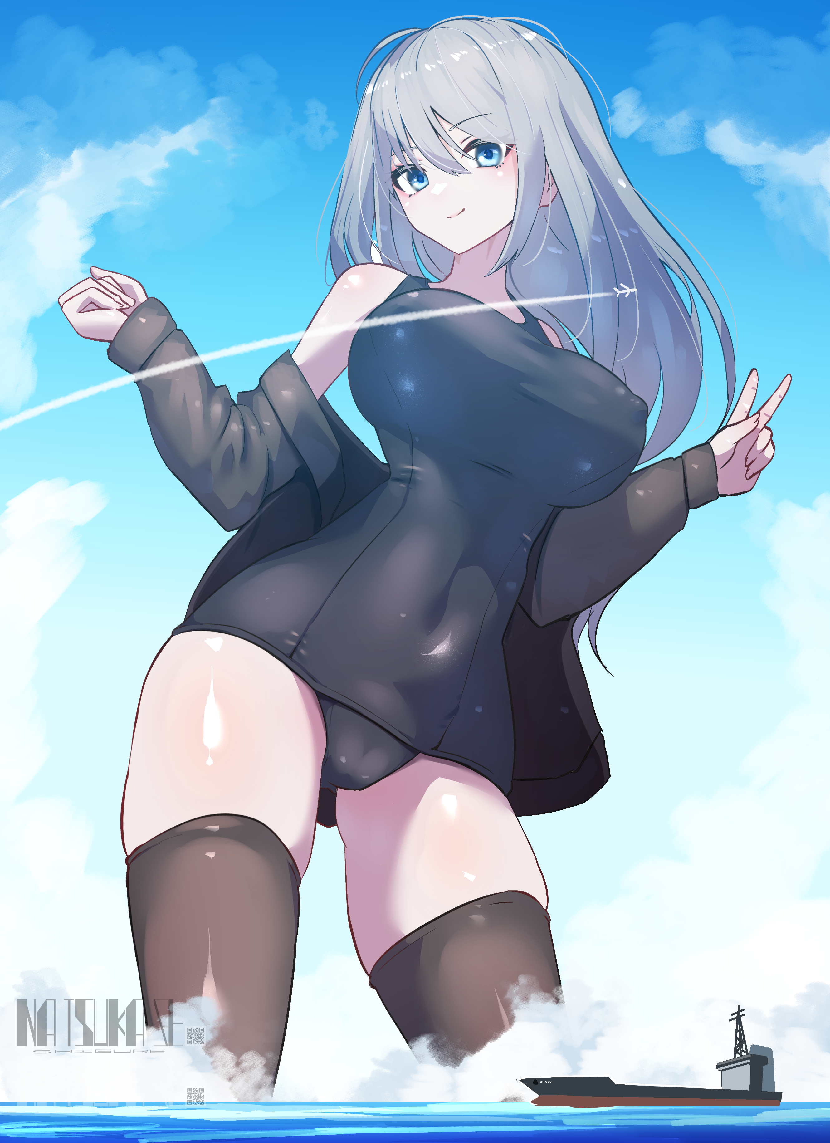 1girlaircraftairplaneblack jacketblack one-piece swimsuitblue eyesblue skyboatbreastscovered erect nipplescovered navelgiantgiantessgrey hairjacketlarge breastslong hairlooking at viewerold school swimsuitone-piece swimsuitopen clothesopen jacketoutdoorsschool swimsuitsignatureskysmileswimsuitthighhighsvwatercraft