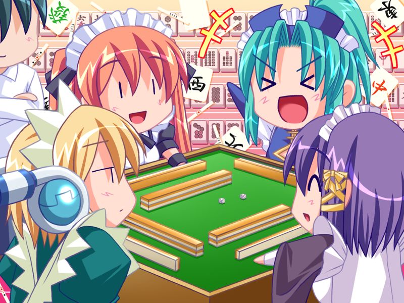 1boy4girlsblonde hairboard gamechibiclosed eyesgreen eyesheadphoneslong hairmahjongmaidmultiple girlsplaying gamesponytailpurple hairred hairshort hairtwintails