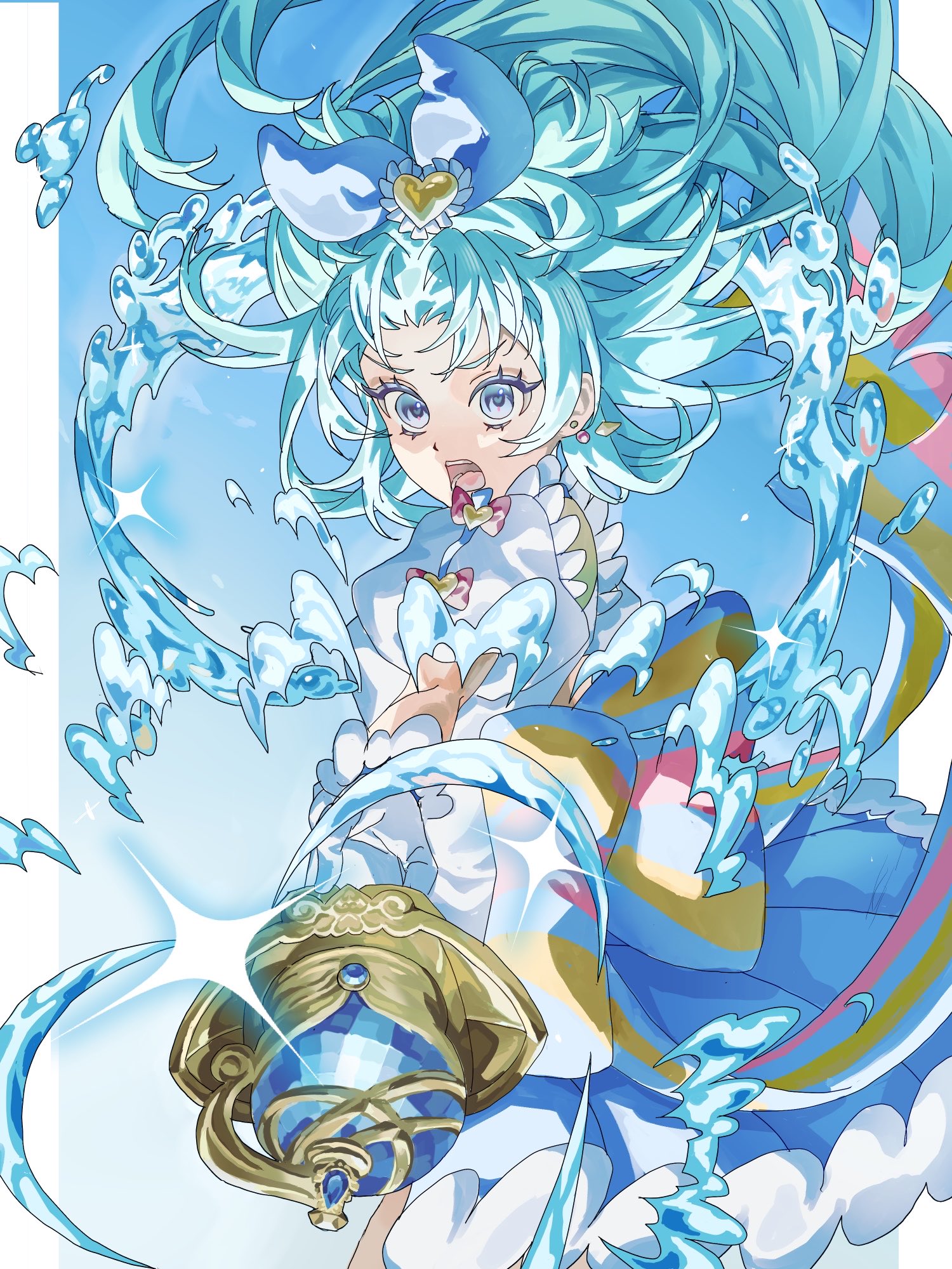 blue eyesblue hairbowearringsfrilled leotardfrillsgloveshair bowhair ornamentheartheart hair ornamentholdingholding weaponjewelryleotardopen mouthpuffy short sleevespuffy sleevesshort sleeveswaterweaponwhite leotard