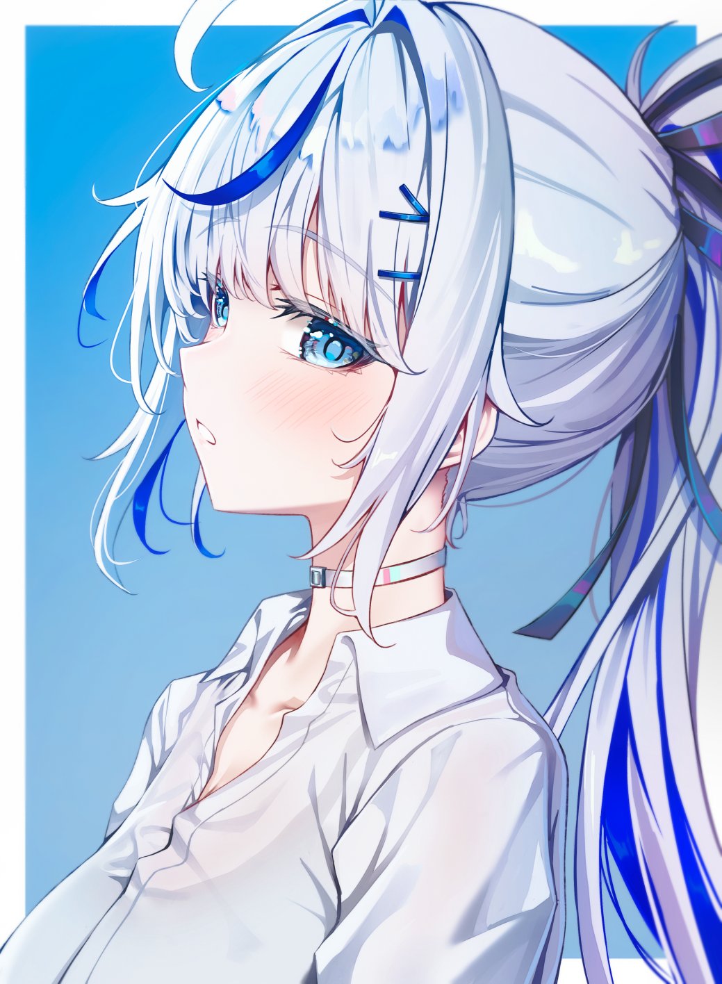 1girlblue backgroundblue eyesblue hairbreastschokercleavagecollared shirtfrom sidegrey hairhigh ponytaillarge breastslong hairlooking at viewermulticolored hairparted lipsponytailshirtsimple backgroundsolostreaked hairupper bodyvirtual youtuberwhite chokerwhite shirt