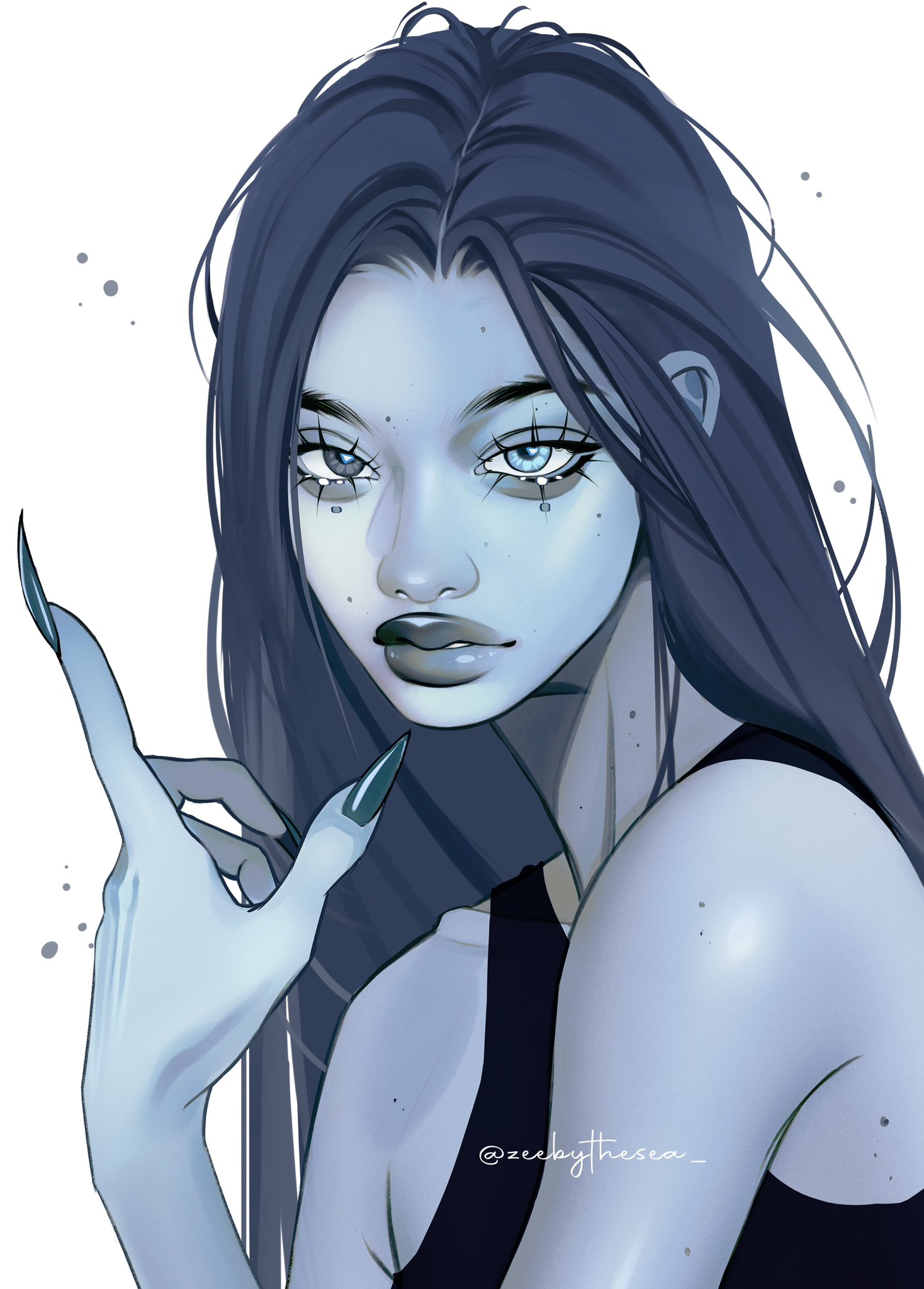 1girlaegyo salasianblack tank topblue eyesblue hairblue nailsblue skincolored skineyelashesfingernailsforeheadhand upheterochromialong fingernailslong hairlooking at viewermolemole on armmole on cheekmole on foreheadmole on neckmole under each eyemole under eyemultiple molesnail polishparted bangsparted lipsstraight hairtank topthick eyebrowsthick lipstwitter usernameupper bodywhite background
