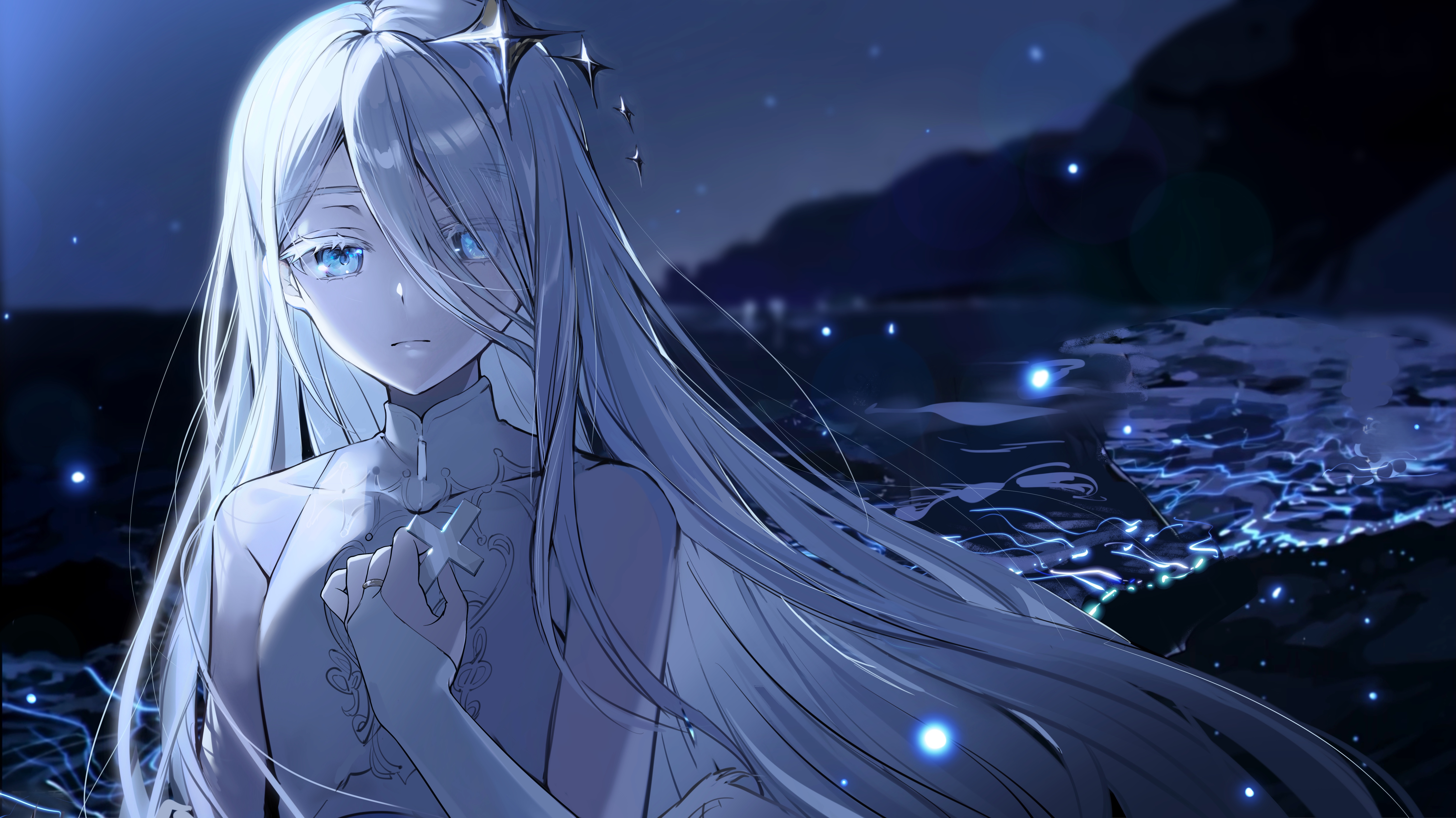 1girlbeachbloom festival (project sekai)blue eyescollarbonecolored eyelashescrossdresselbow glovesexpressionlessgloveshair ornamenthigh collarholdingholding crossjewelrylight particleslong hairmountainous horizonnightnight skyoceanofficial alternate costumeofficial alternate hair lengthofficial alternate hairstyleringskysleevelesssleeveless dresssolostar (symbol)star hair ornamentswept bangsupper bodyvery long hairwaterwavingwhite eyelasheswhite hair