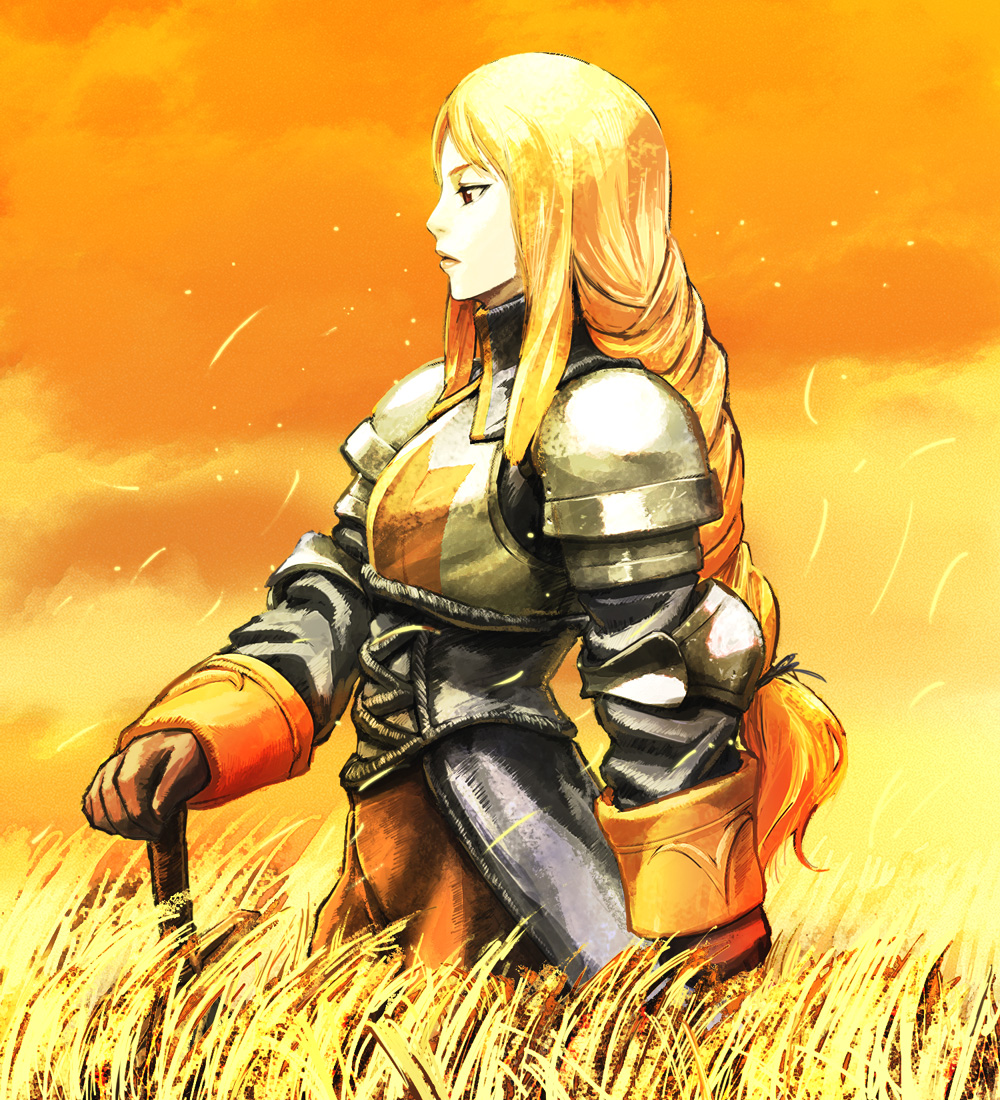 1girlarmorblonde hairbraidbraided ponytailfemale focusgloveshands on hiltlong hairred eyessingle braidsoloswordweapon