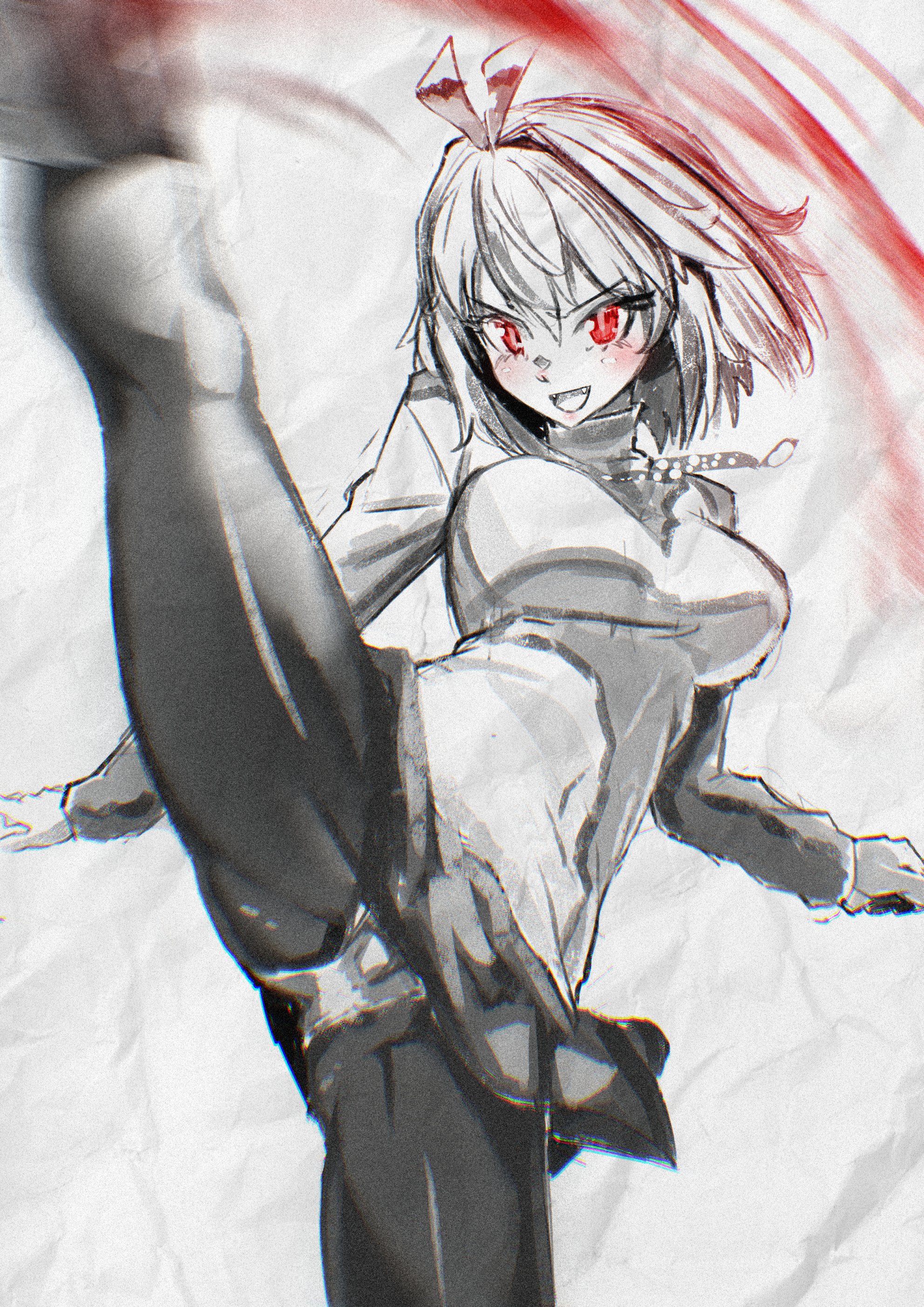 saishijyou, rappa (honkai: star rail), honkai: star rail, honkai (series), absurdres, commentary request, highres, 1girl, abs, arm up, asymmetrical legwear, asymmetrical sleeves, baseball cap, belt, black hat, black leg warmers, black shoes, black shorts, breasts, bridal gauntlets, crop top, cropped jacket, fang, fishnet bridal gauntlets, fishnet top, fishnets, green eyes, grin, hat, horned hat, jacket, kuji-in, leg warmers, long hair, looking at viewer, medium breasts, midriff, monkey, navel, open-toe shoes, open clothes, open jacket, pink hair, ponytail, red arm warmers, red jacket, shirt, shoes, short shorts, shorts, sidelocks, single bridal gauntlet, smile, solo, spray can, teeth, tied shirt, uneven sleeves, very long hair, white belt, white shirt, wrist belt, zipper, zipper pull tab