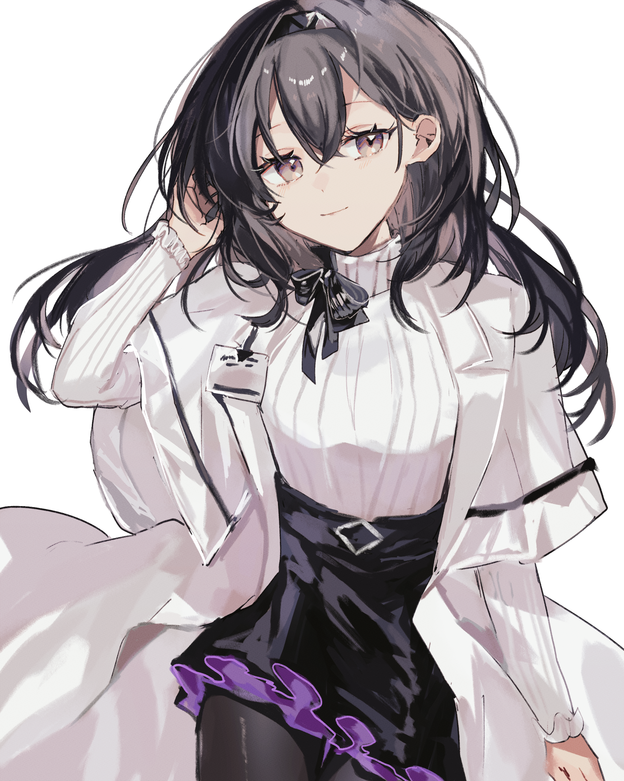 1girlarm upblack hairblack pantyhoseblack skirtclosed mouthcoatgrey eyeshair behind earhair between eyeshand in own hairlab coatlight smilelong hairlong sleeveslooking at vieweropen clothesopen coatpantyhoseribbed sweatersimple backgroundskirtsolosweaterturtleneckturtleneck sweaterwhite backgroundwhite coatwhite sweater