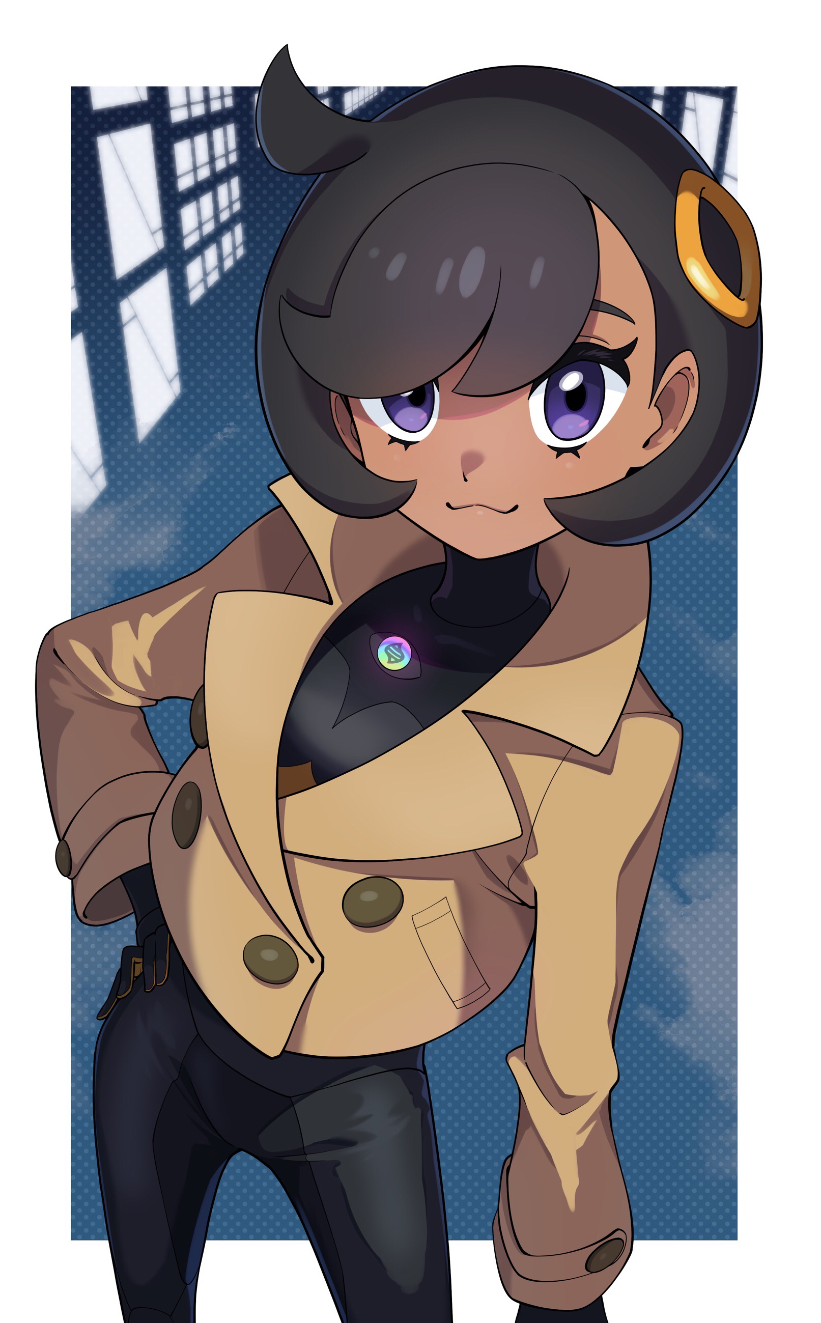 :31girlaged upblack bodysuitblack glovesblack hairbodysuitbodysuit under clothesborderbrown jacketbuttonsclosed mouthcollared jacketdark skindark-skinned femaleeyelashesgloveshair between eyeshair ornamenthand on own hiphappyjacketleaning to the sidelooking at viewermega stonepurple eyesshort hairsidelockssmilesolostandingswept bangswhite border