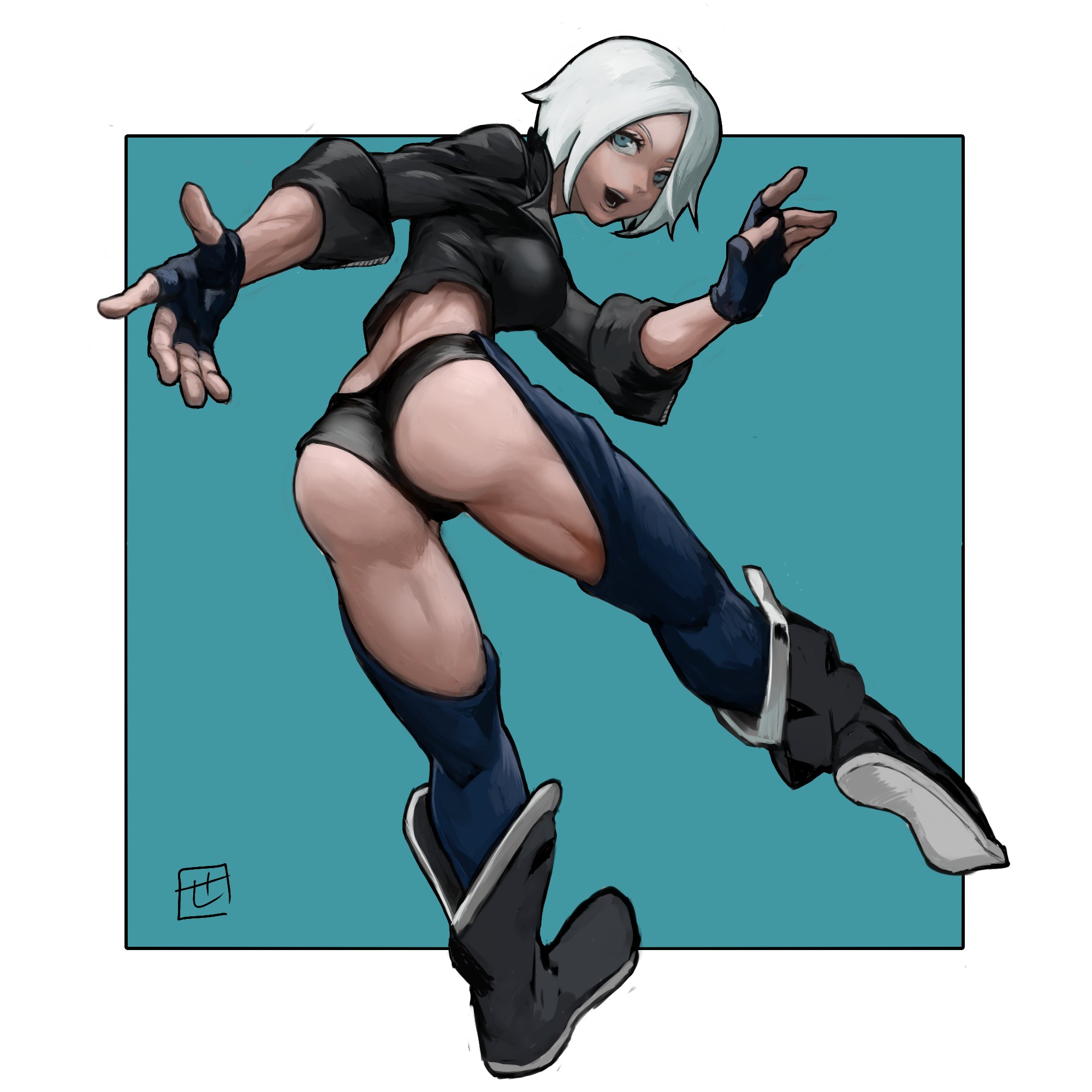 1girlbackless pantsblue eyesbootsbrabreastschapscleavagecowboy bootscrop topcropped jacketfingerless glovesgloveshair over one eyejacketlarge breastsleatherleather jacketlooking at viewermidriffnavelpantiespantsshort hairsmilesolostraplessstrapless bratonedtoned femaleunderwearwhite hair
