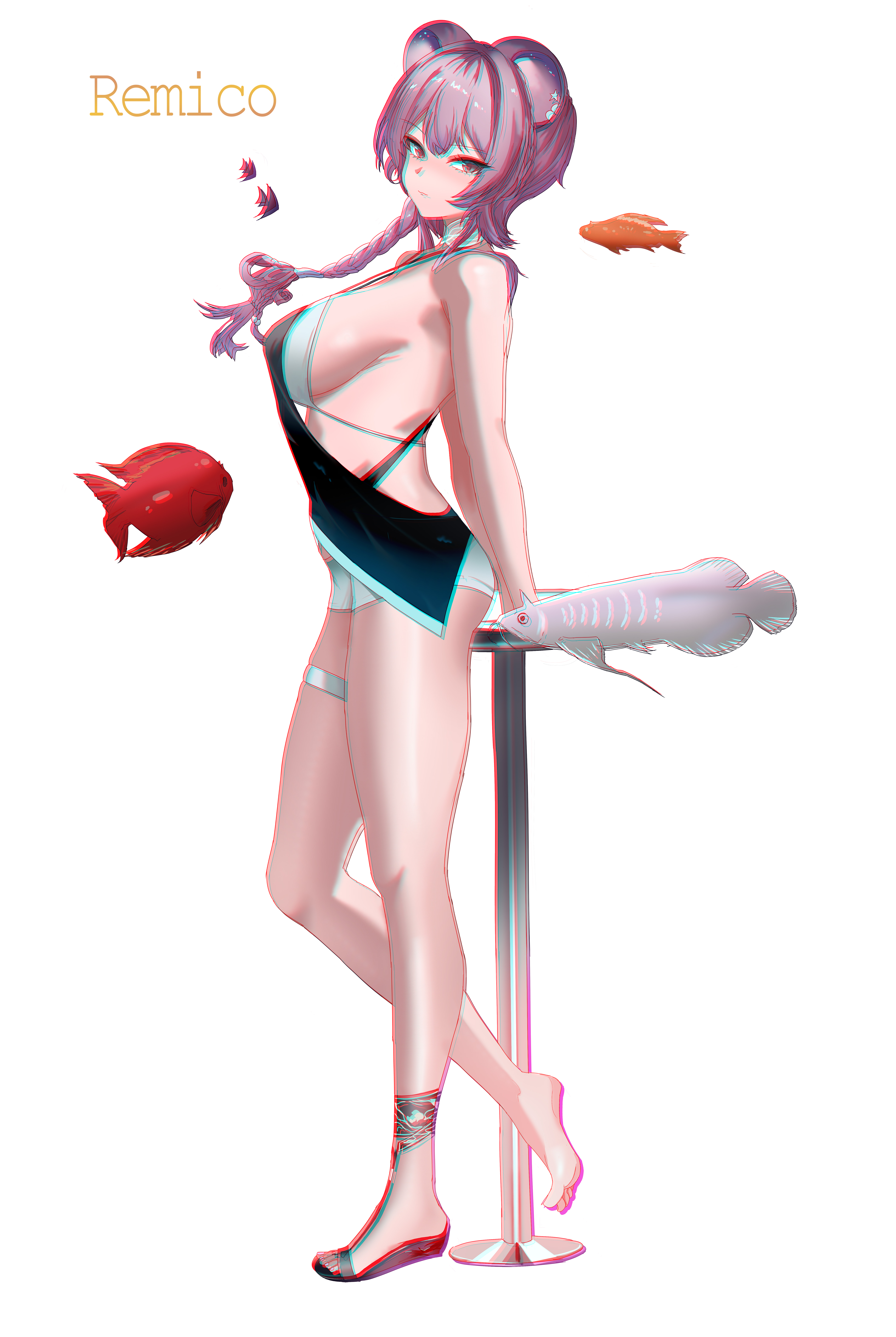 1girlanimalanimal earsartist namebikinibraidbreastschromatic aberrationclosed mouthfishfull bodygrey bikiniheavy chromatic aberrationlong hairlooking at viewermedium breastspink eyespink hairremicosandalssideboobsimple backgroundsingle bare footsingle sandalsolostandingswimsuitthigh strapwhite background