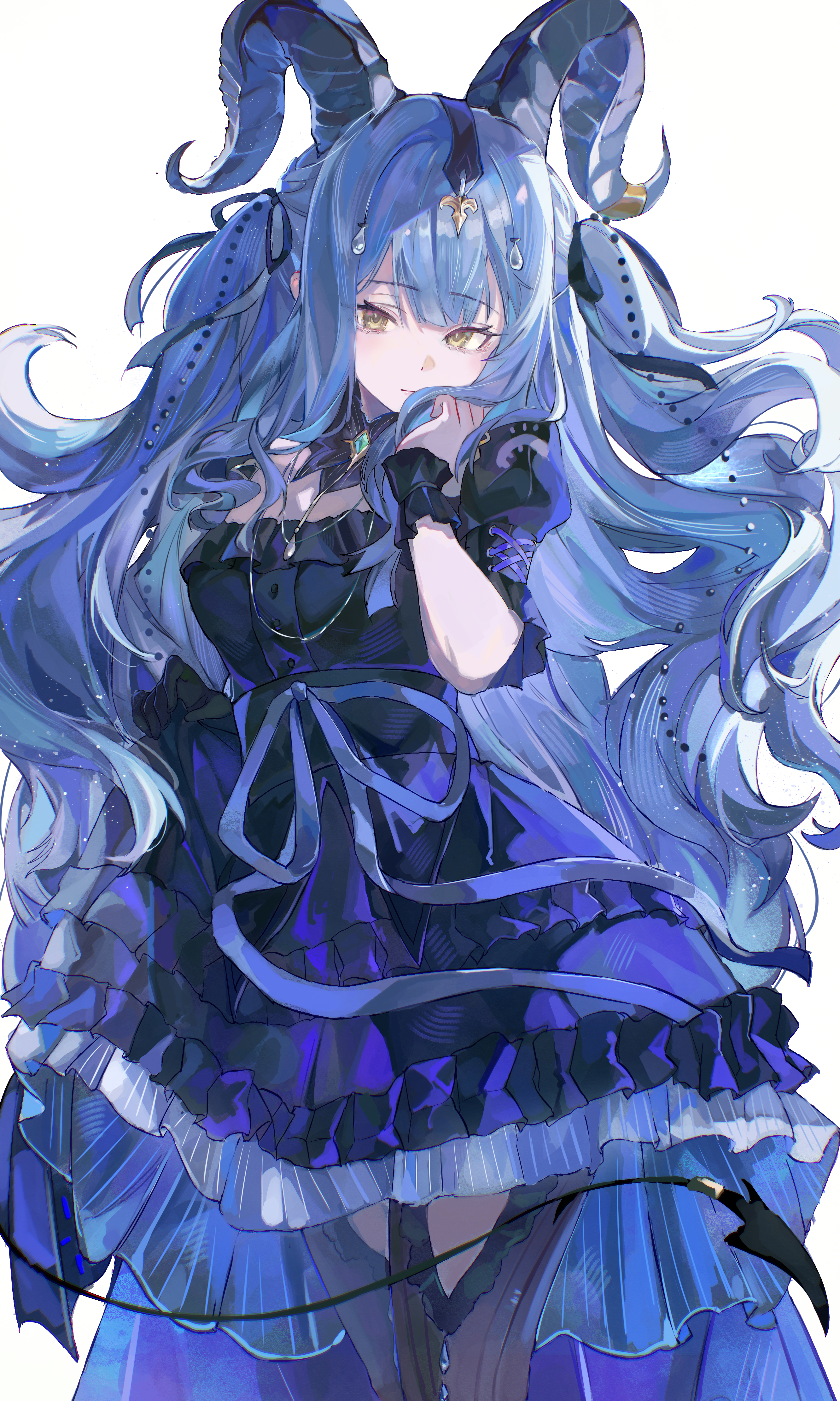 1girlblack dressblack glovesblack hornsblue hairclosed mouthcurled hornsdemon hornsdemon taildressfeet out of framefrilled dressfrillsgloveshair ornamenthornshuge hornslong hairlooking at viewerofficial alternate costumesimple backgroundsingle gloveskirt holdsolostandingtailtwo side upvery long hairwhite backgroundwrist wrapyellow eyes