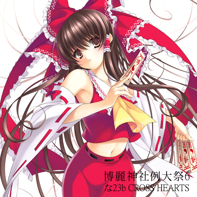 1girlarmpitsblushbowbrown eyesbrown hairdetached sleevesfemale focusfrillshair bowhair ribbonholdingjapanese clotheslooking at viewermidriffmikonavelofudaribbonsoloyin yang