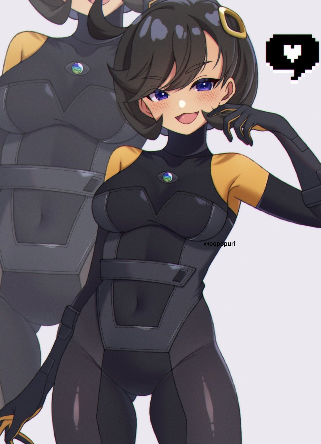 1girlblack bodysuitblack hairblue eyesblushbodysuitbreastsdark skindark-skinned femaleglovesgluteal foldheartlooking at viewermedium breastsmega stoneopen mouthpurple eyesshort hairsimple backgroundsmilesolowhite backgroundzoom layer