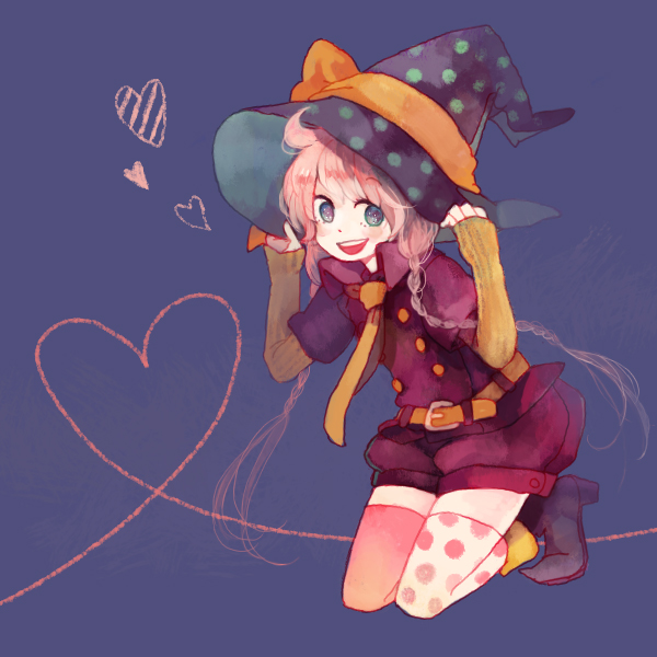 1girlasymmetrical legwearbeltblue eyesfemale focushatheartlong hairmismatched legwearnecktiepink hairpink thighhighspolka dotshortssmilesolothighhighswitch hat