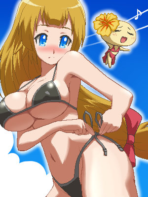 00s1girlandroidbikiniblonde hairblue eyesblushbreastsclouddayflowerjaggy lineslarge breastslong hairmusical noteoekakiside-tie bikini bottomskyswimsuittime paradoxtying