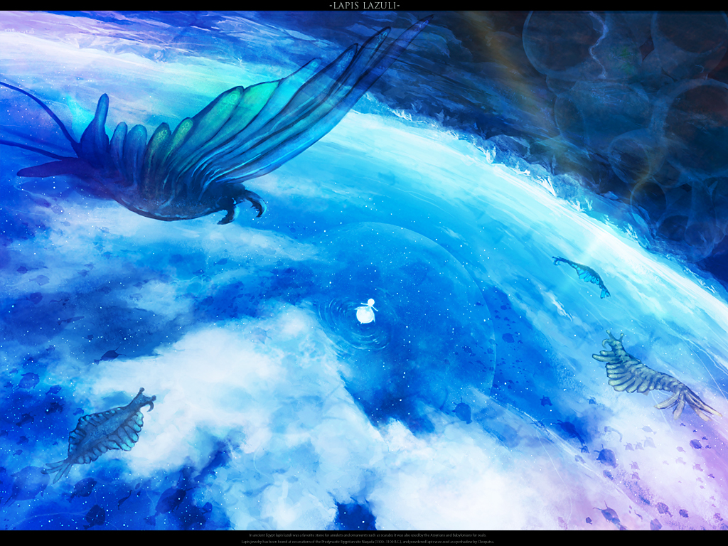 1girlanomalocarisfemale focusfishfrom aboveletterboxedprehistoric animalreflectionripplesscenerysolowaterwater world