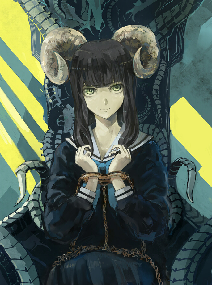 1girlblack hairchaincuffsfemale focushornslong hairschool uniformserafukushacklessittingsmilesolothroneyellow eyes