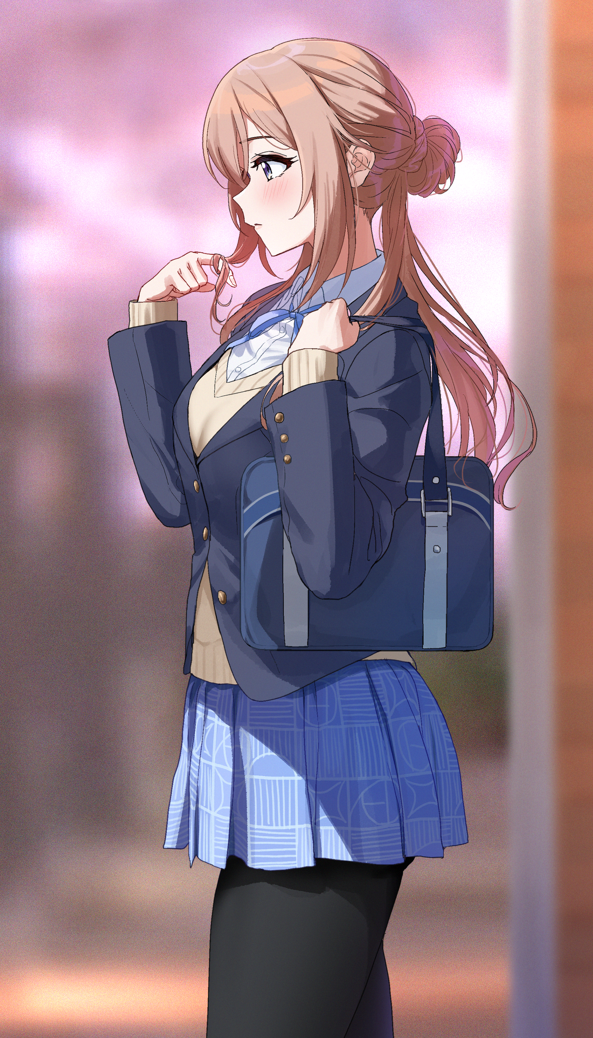 1girlbagblack jacketblack pantyhoseblue eyesblue ribbonblue skirtblurryblurry backgroundblushbrown haircardiganclosed mouthfeet out of framefrom sidehair bunhatsuboshi gakuen school uniformjacketlong hairlong sleevesneck ribbonpantyhoseplaying with own hairpleated skirtribbonschool bagschool uniformshirtshort shortsshortssingle hair bunskirtsolostandingwhite shirtyellow cardigan