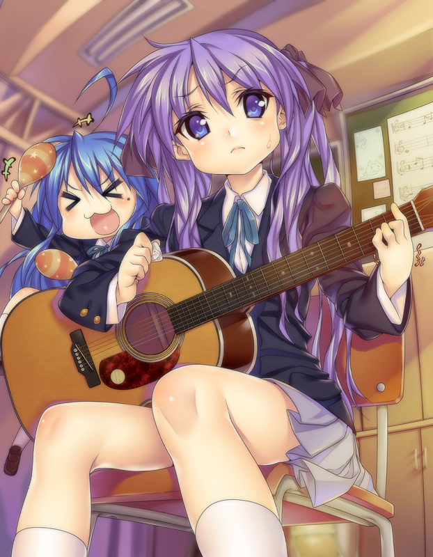 1boy2girlsacoustic guitarahogeblazerblue eyesblue hairclosed eyesclosed mouthcompany connectionconfusedcosplayguitarhair ribbonindoorsinstrumentjacketlong hairmaracasmolemole under eyemultiple girlsparodypleated skirtpurple eyespurple hairraised eyebrowribbonsakuragaoka high school uniformschool uniformsittingskirtsweattsurimetwintails