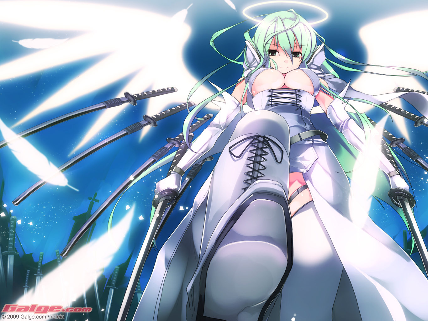 1girl2009breastsfeathersfemale focusfloating objectfloating swordfloating weapongreen eyesgreen hairhalokatanalarge breastsmatching hair/eyesmolemole under eyesoloswordweaponwings