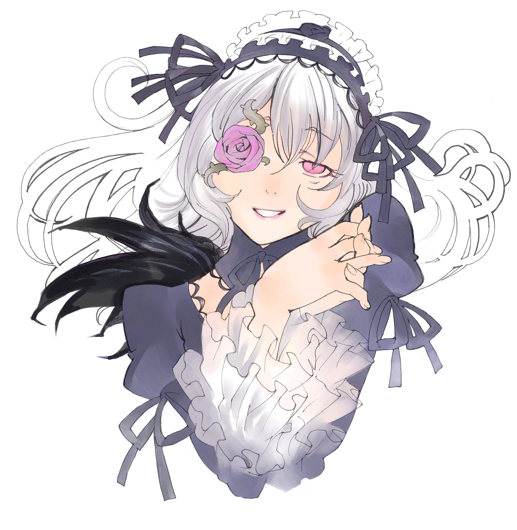 00sdresseyepatchfrillsgrinhairbandlong hairown hands claspedown hands togetherpurple eyessimple backgroundsmilesolowhite backgroundwings