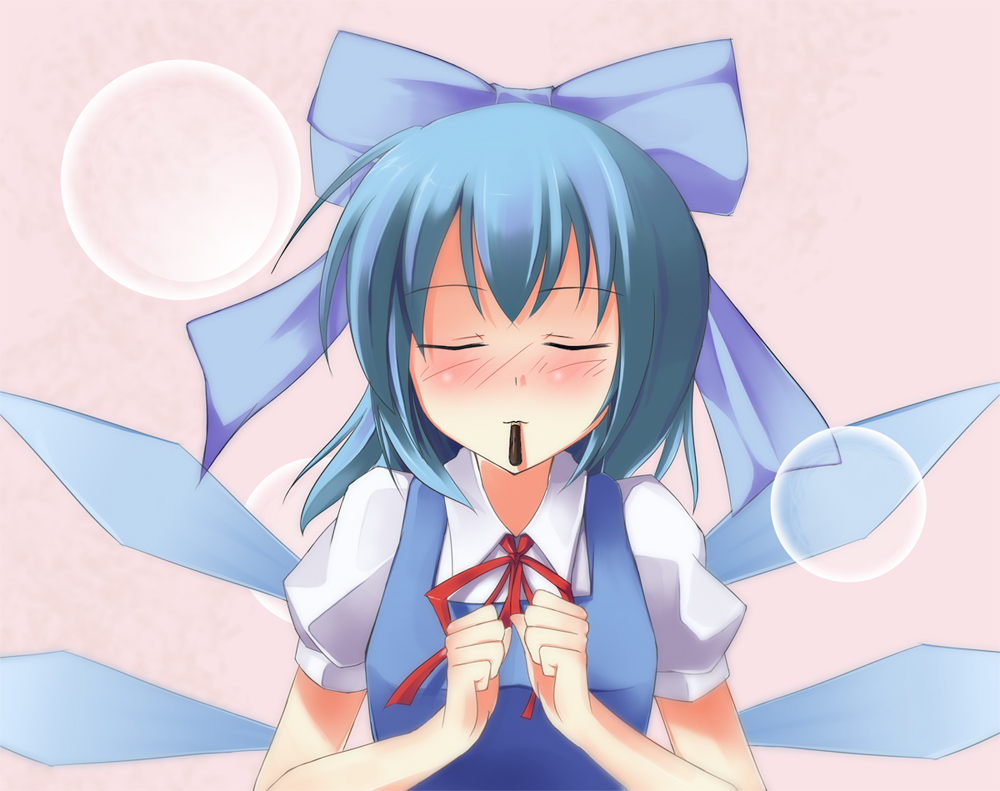 1girlblue hairblushclosed eyesfeedingfemale focusfoodhair ribbonincoming kissmouth holdpockypocky kisspov feedingribbonshared foodsharing foodsolo