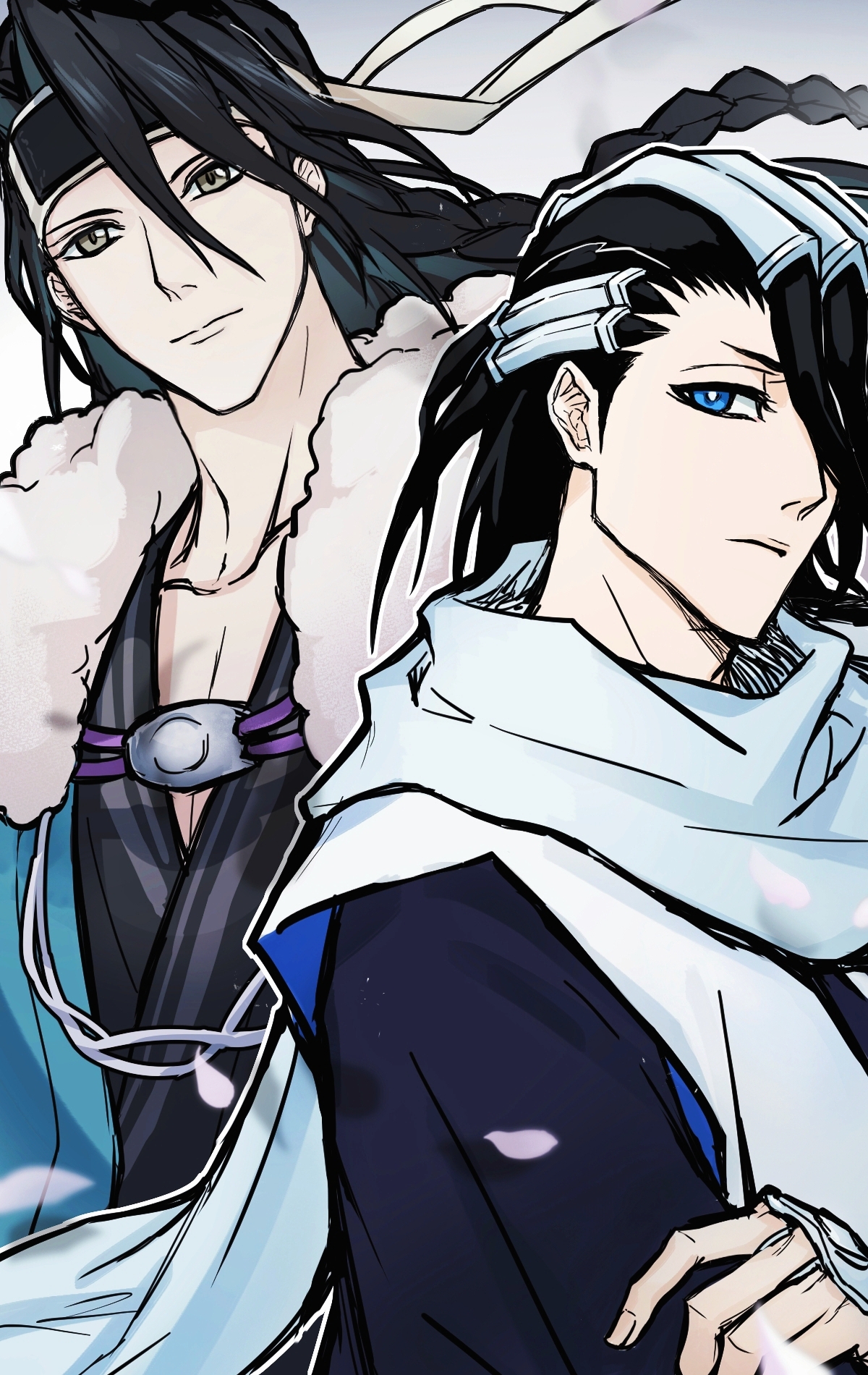 2boysblack hairblue eyesbraidbrown eyescrossoverfalling petalsfur shawlgrey backgroundhair between eyeshair ornamenthair over one eyejapanese clotheskimonolong hairlooking at viewermale focusmultiple boysnanjizhidian089petalsscarfshawlupper body