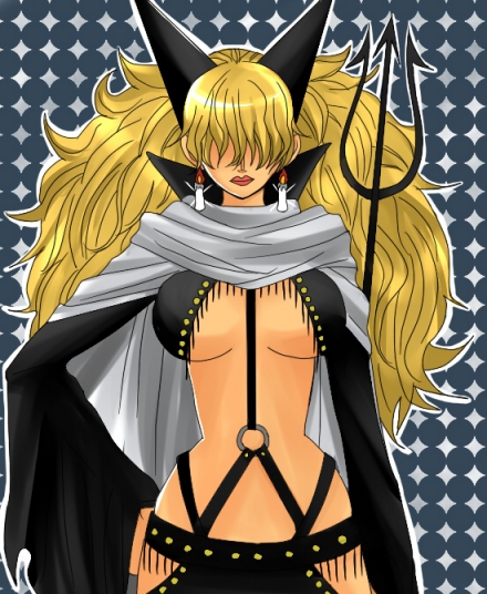1girlblonde haircandlecloakearringsfemale focusfringe trimhair over eyeshand on own hiphornsimpel downjewelrylipstickmakeuppolearmrevealing clothessolospeartridentweapon