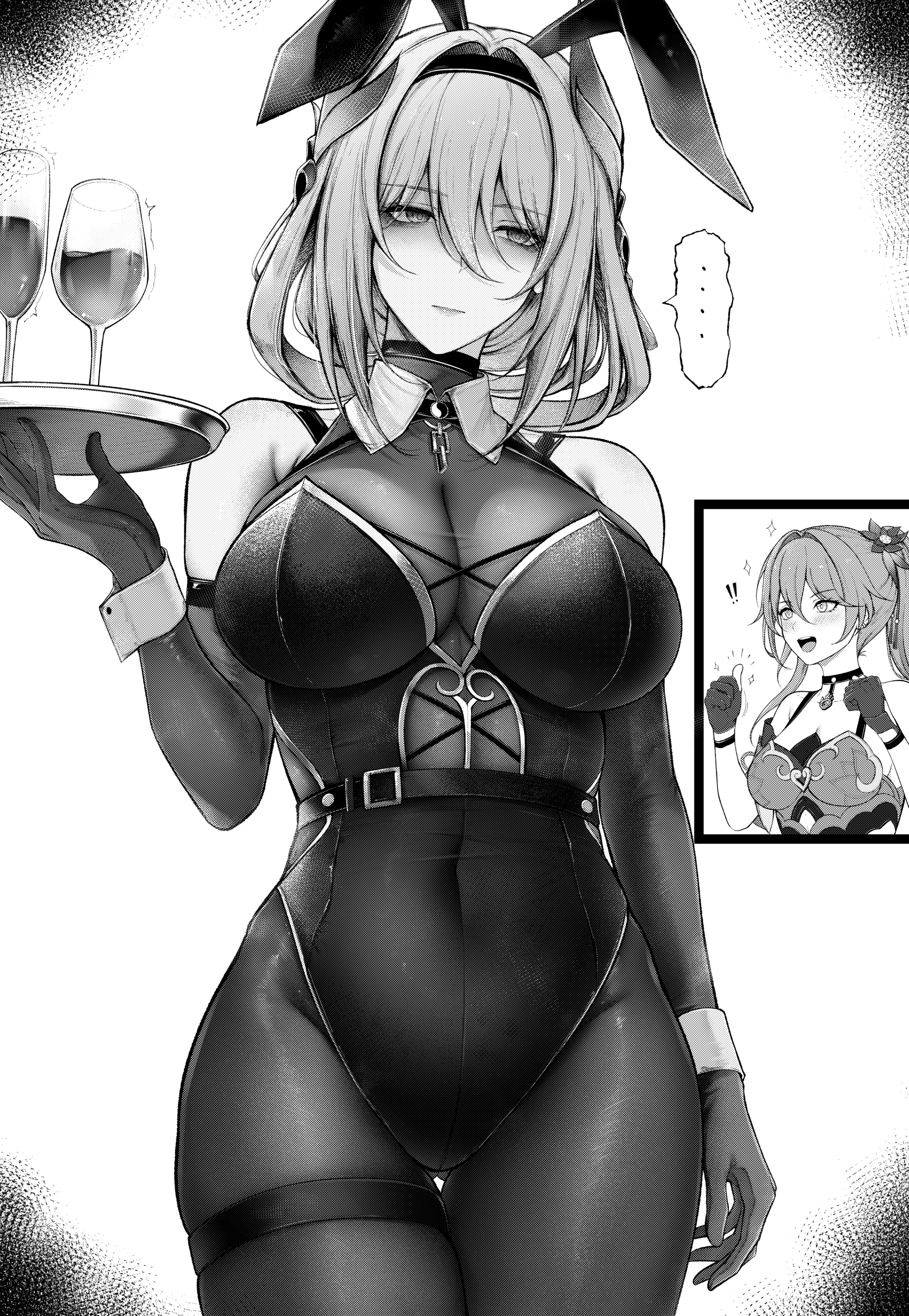1boy2girlsalternate costumeanimal earsannoyedbare shouldersblushbreastscleavageclosed mouthcovered navelcowboy shotcupdrinking glasselbow glovesfake animal earsflowerglovesgluteal foldgreyscalehair between eyeshair flowerhair intakeshair ornamenthairbandholdingholding traylarge breastsleotardlong hairmedium breastsmonochromemultiple girlsopen mouthpantyhosepartially fingerless glovespartially shaded faceplayboy bunnyponytailrabbit earssee-through cleavagesee-through clothesskindentationsmilespoken ellipsisthigh gapthigh strapthighsthumbs uptraywrist cuffs
