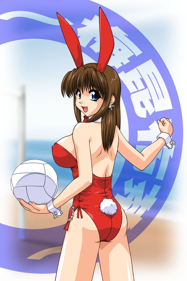 1girlanimal earsassballbare legsbeachblue eyesbreastsbrown haircovered erect nipplesfake animal earsfemale focuslarge breastslong hairlooking backplayboy bunnyrabbit earssolotailvolleyballvolleyball (object)