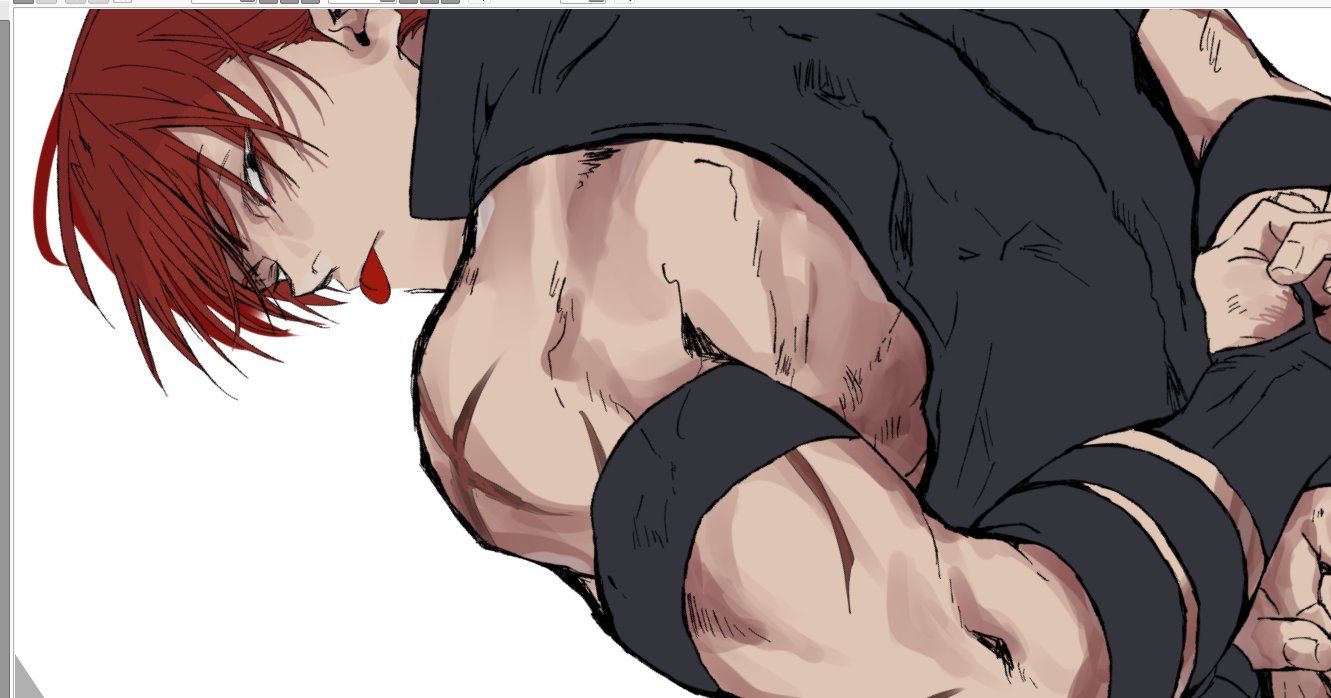 1boyarmbandart program in frameblack eyesfingerless glovesgloveslooking at viewerlooking backmale focusmultiple scarsred hairscarscar on armshirtshort hairsimple backgroundsleevelesssleeveless shirtsolotonedtoned maletonguetongue outupper bodywhite background