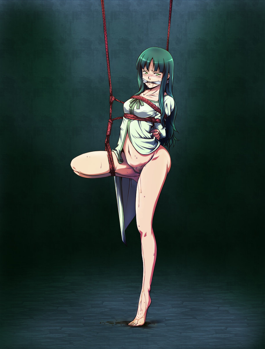 aoi tohsakaarms behind backarms tied behind backblushbound armsFlag for Deletiongaggreen eyesgreen hairno pantiesno pantspeeingpubic hairsolostanding on one legurination