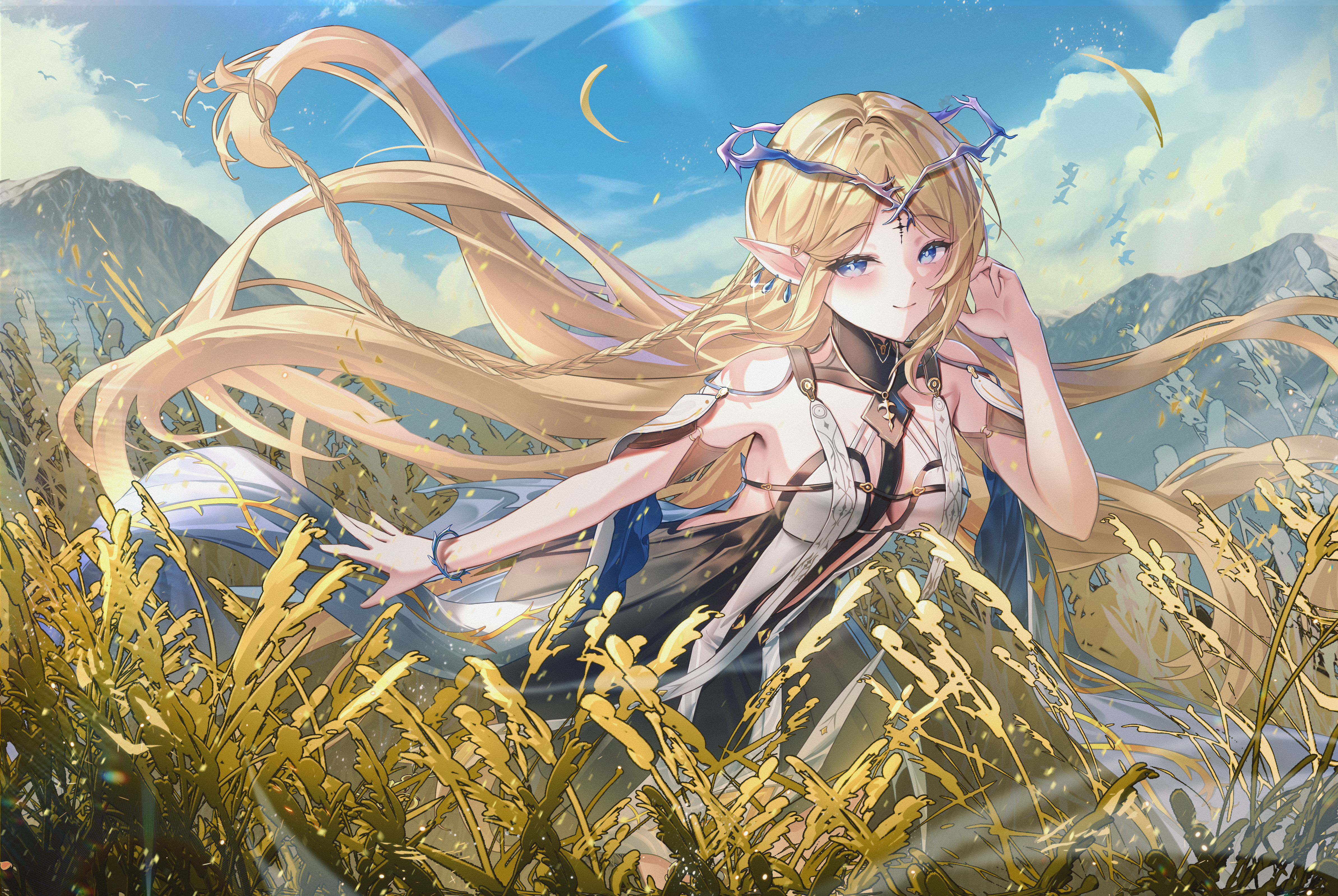 1girlbare shouldersblack collarblack dressblonde hairblue eyesblue skybreastscollarcrown of thornsdaydressearringshand upjewelrylong hairlooking at viewermedium breastsmultiple earringsnecklaceoutdoorsparted bangspointy earssidelocksskysolotabardtacet mark (wuthering waves)very long hairwheatwhite tabardwind