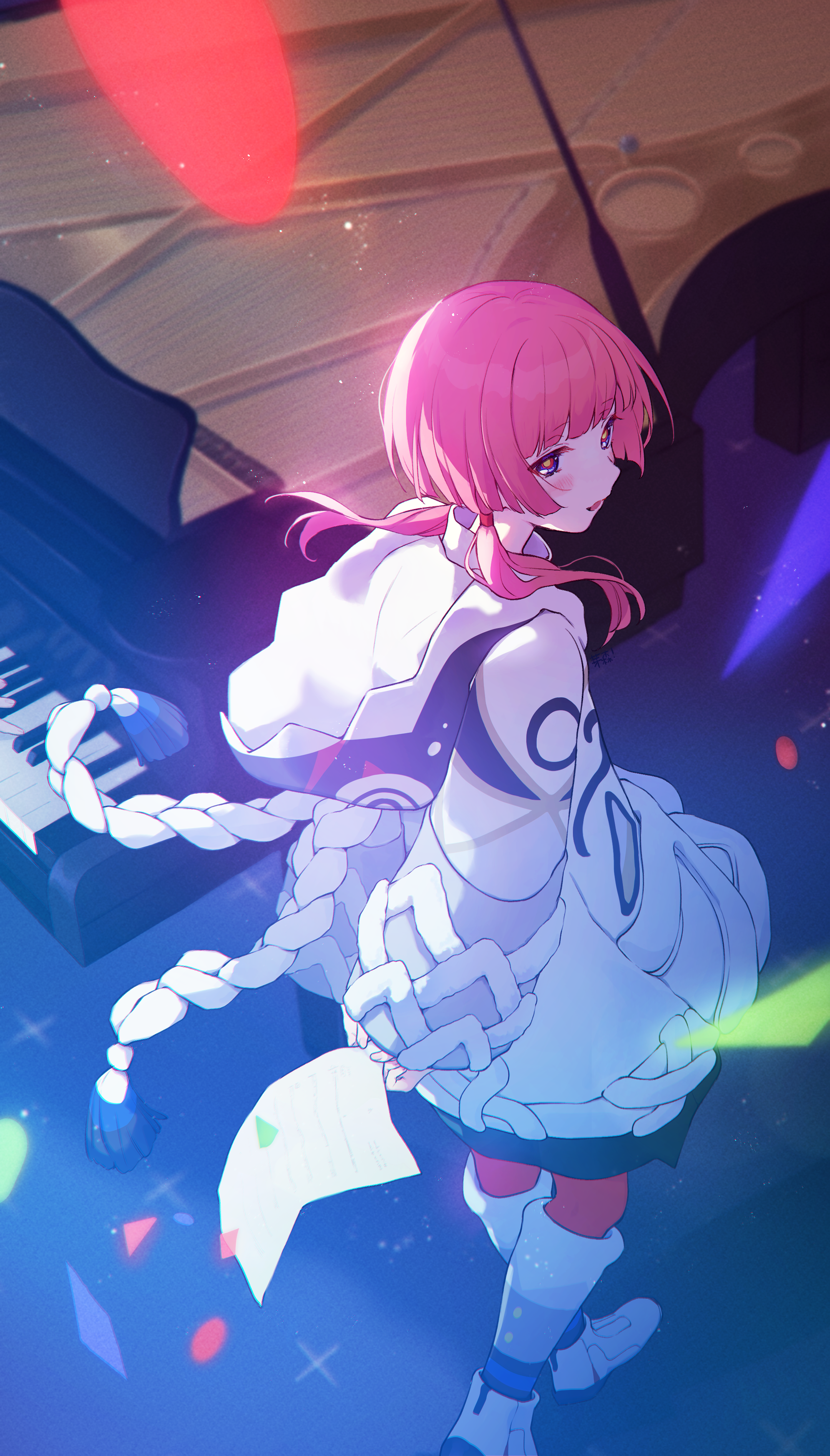 1girlarms behind backblue eyesbootsfrom abovefrom behindholdingholding paperhoodhood downhooded jacketinstrumentjacketlong hairlong sleeveslooking at viewerpantyhosepaperpianopink hairred pantyhosesolotwintailsvirtual youtuberwalkingwhite bootswhite jacketwide sleevesyellow pupils