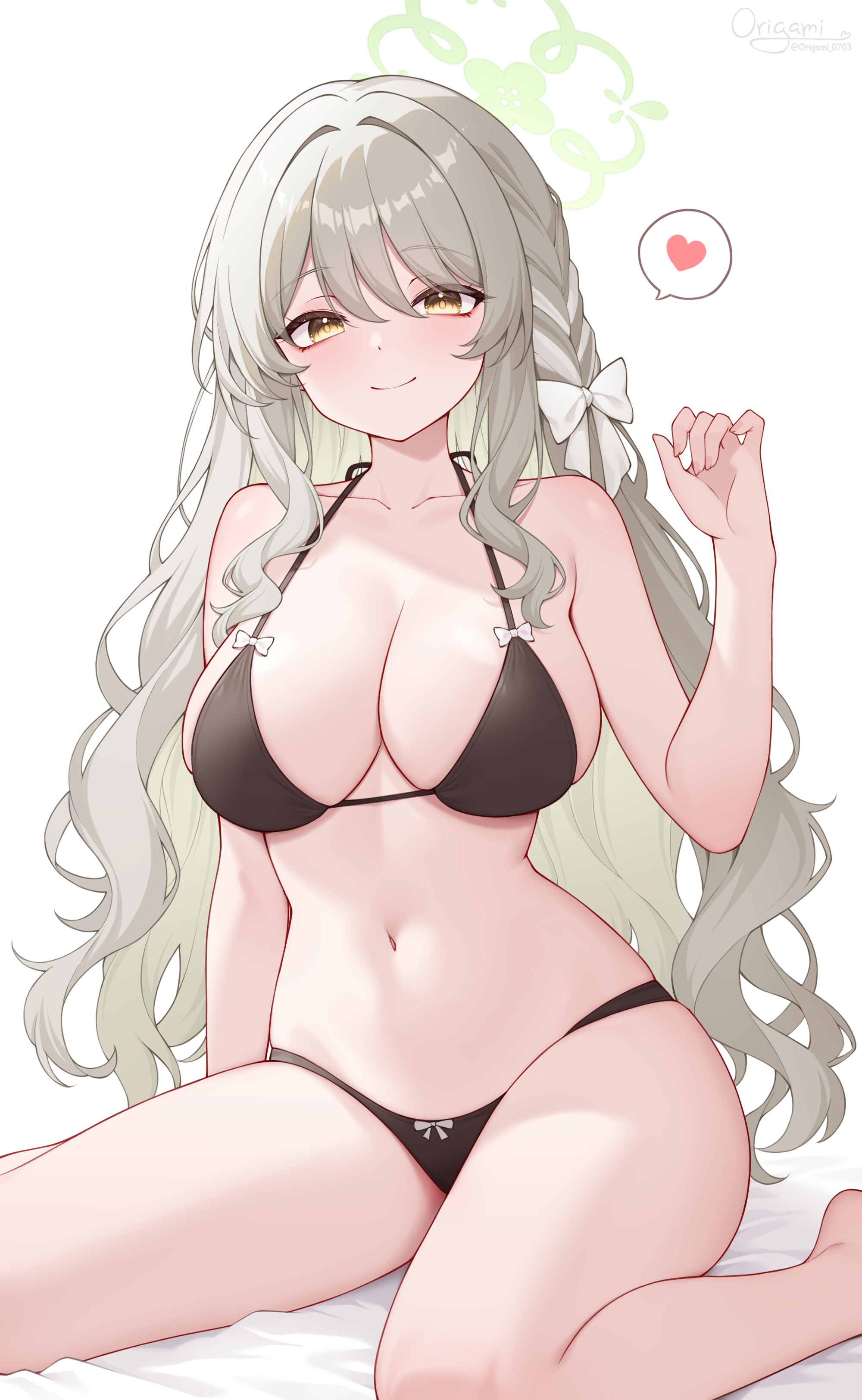1girlbikiniblack bikiniblushbreastscleavageclosed mouthcollarbonegreen halohaloheartlarge breastslong hairlooking at viewernavelsimple backgroundsittingsmilesolostomachswimsuitthighswhite backgroundyellow eyes