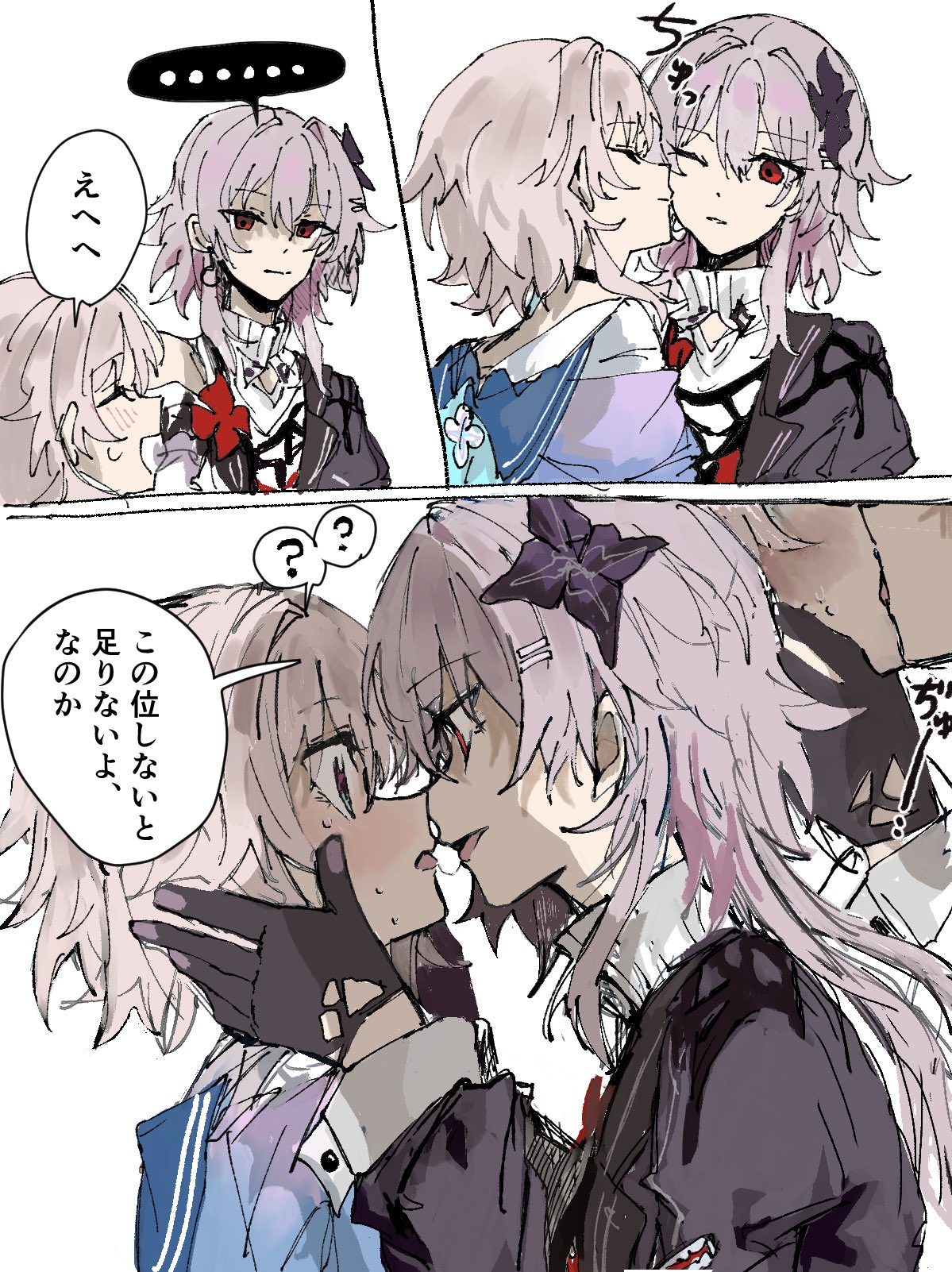1boy2girlsafter kissblue sailor collarchokercollardual personaflowergloveshair flowerhair ornamenthairclipjacketkisslong hairmulticolored jacketmultiple girlsparallel hairclipspink hairred eyesromaji textsailor collartonguetwo-tone jacketyuri