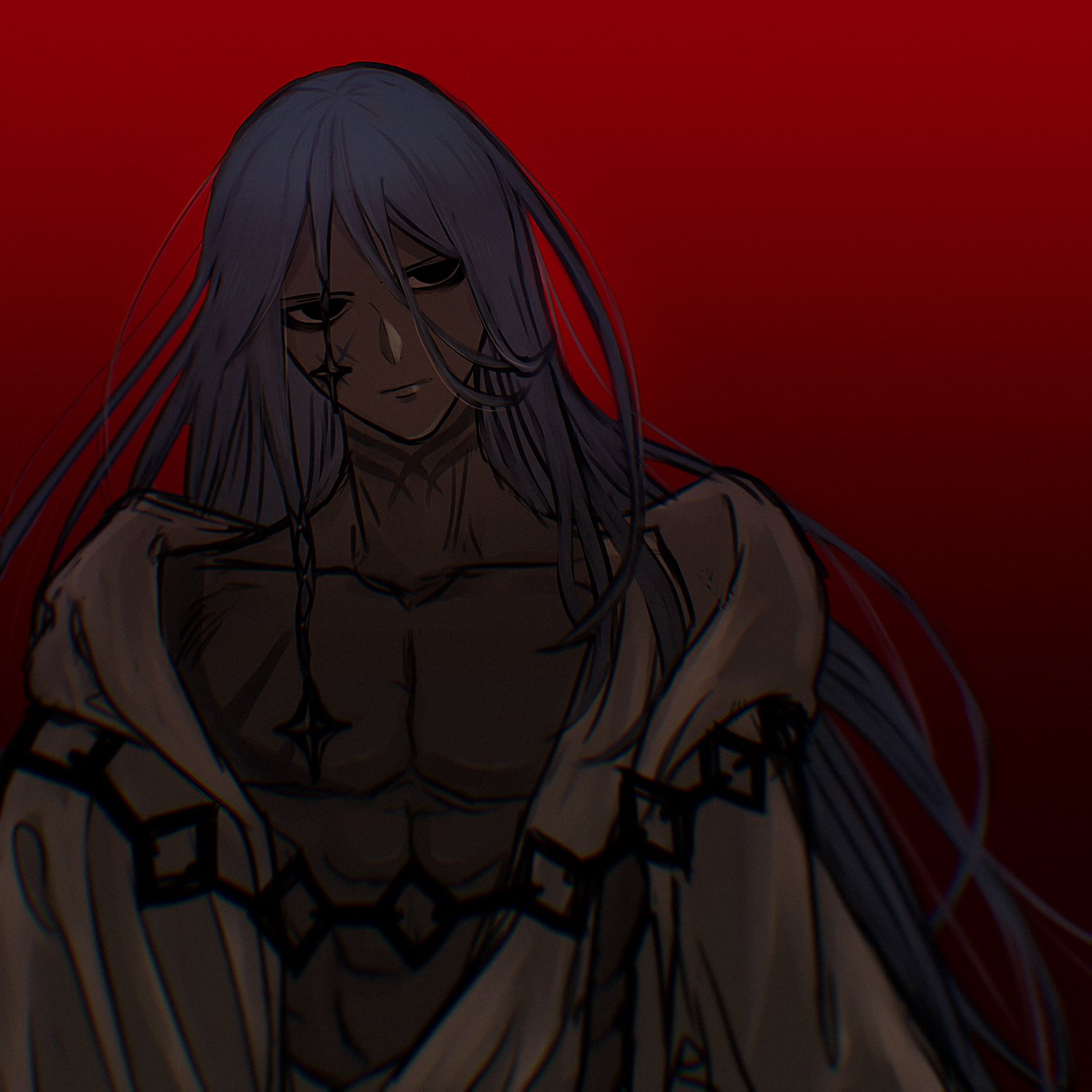 1boyazrael (grand assassin) (fate)bags under eyesblack eyescolored skindark skindark-skinned malefacial scargradient hairgrey hairgrey skinhair between eyeshair ornamentlong hairmale focusmulticolored hairpectoralsred backgroundrobescarscar on cheekscar on chestscar on facescar on necksolotatibna131upper bodywhite robe