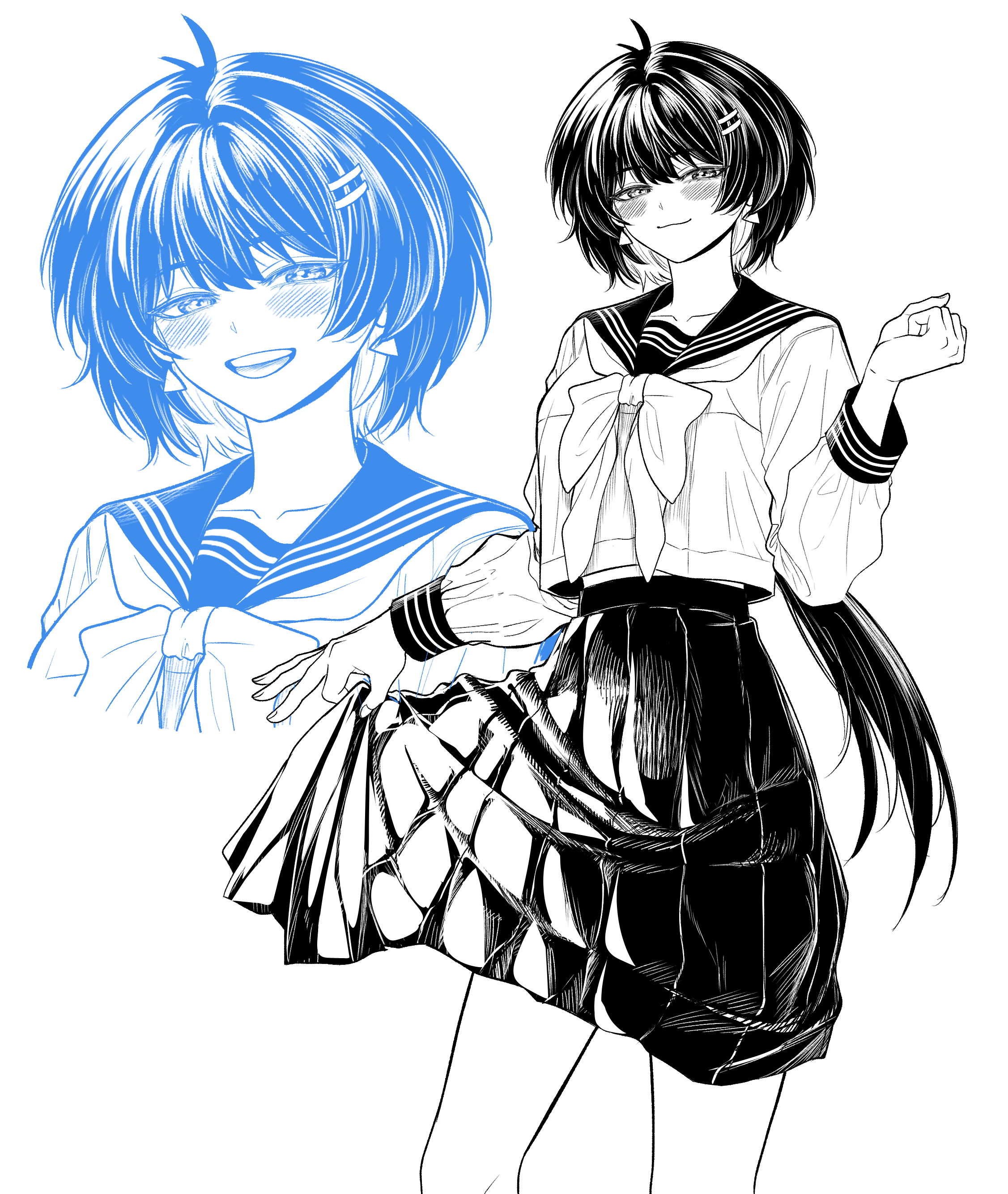 1girlalternate costumeblushclosed mouthcollarboneearringsgreyscalehair ornamenthairclipjewelrylong hairlong skirtlong sleeveslooking at viewerlow ponytailmonochromemultiple viewsparallel hairclipsponytailsailor collarshirtsimple backgroundskirtsmiletriangle earringswhite background
